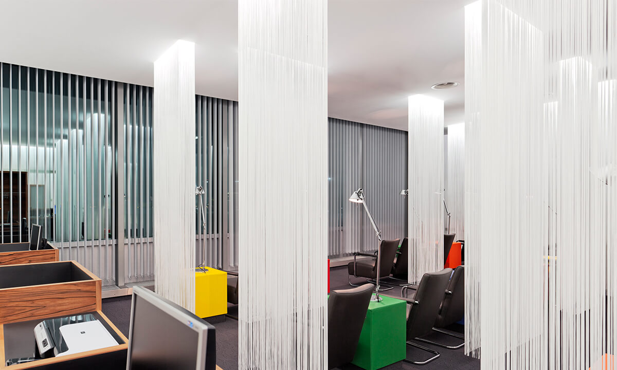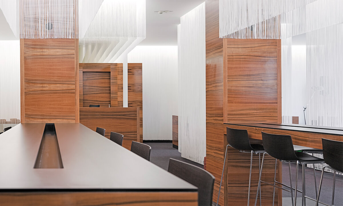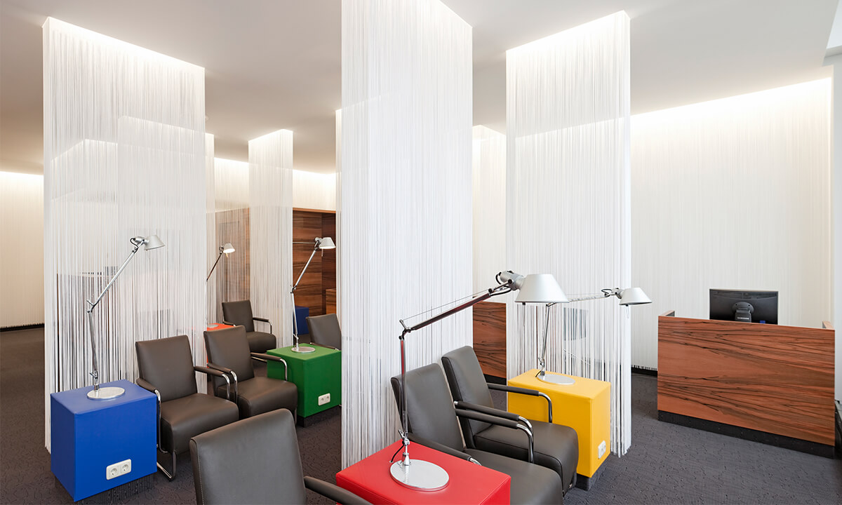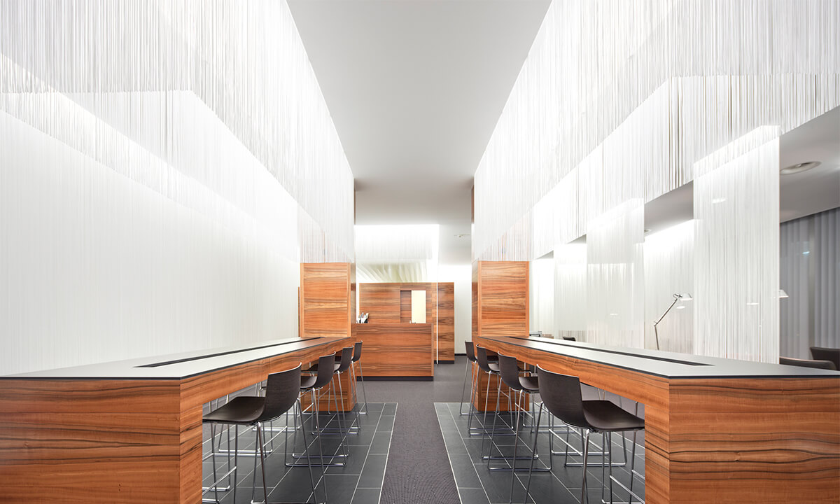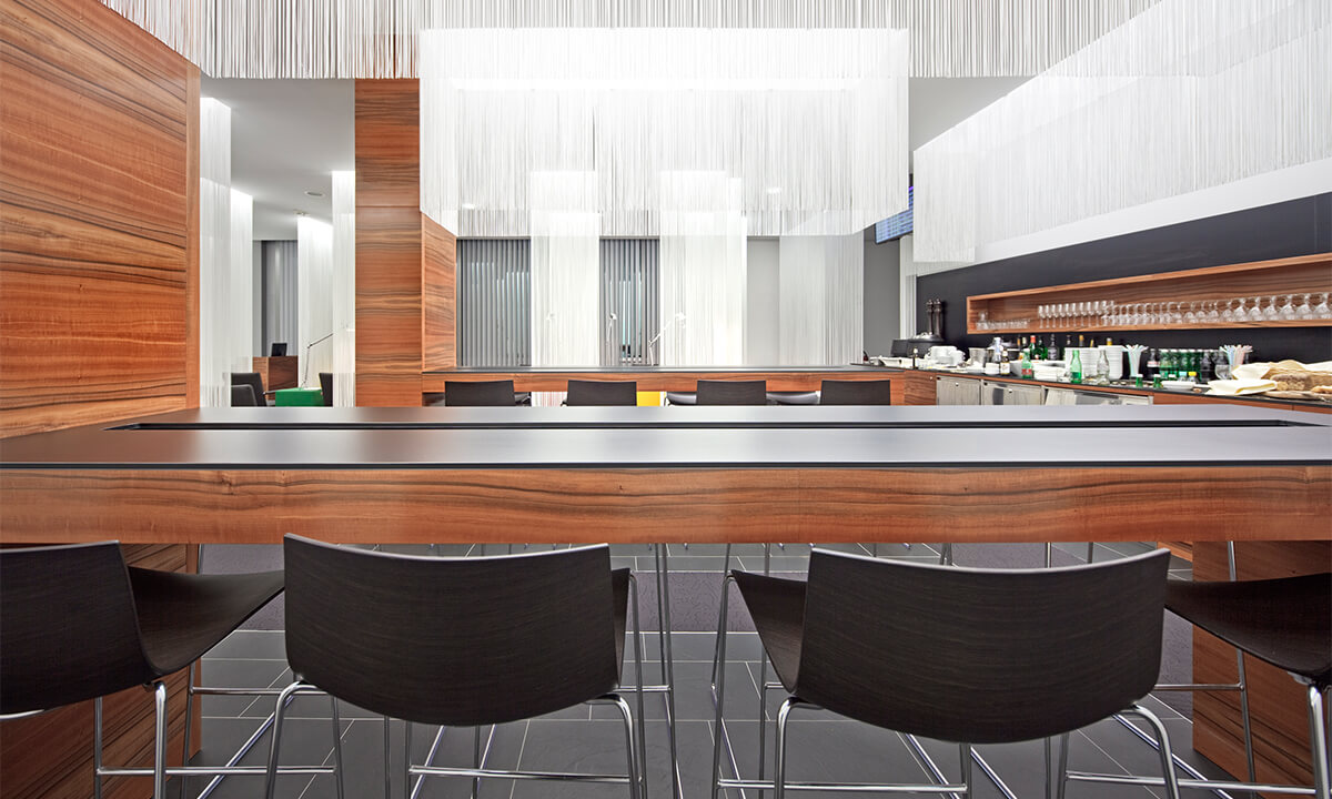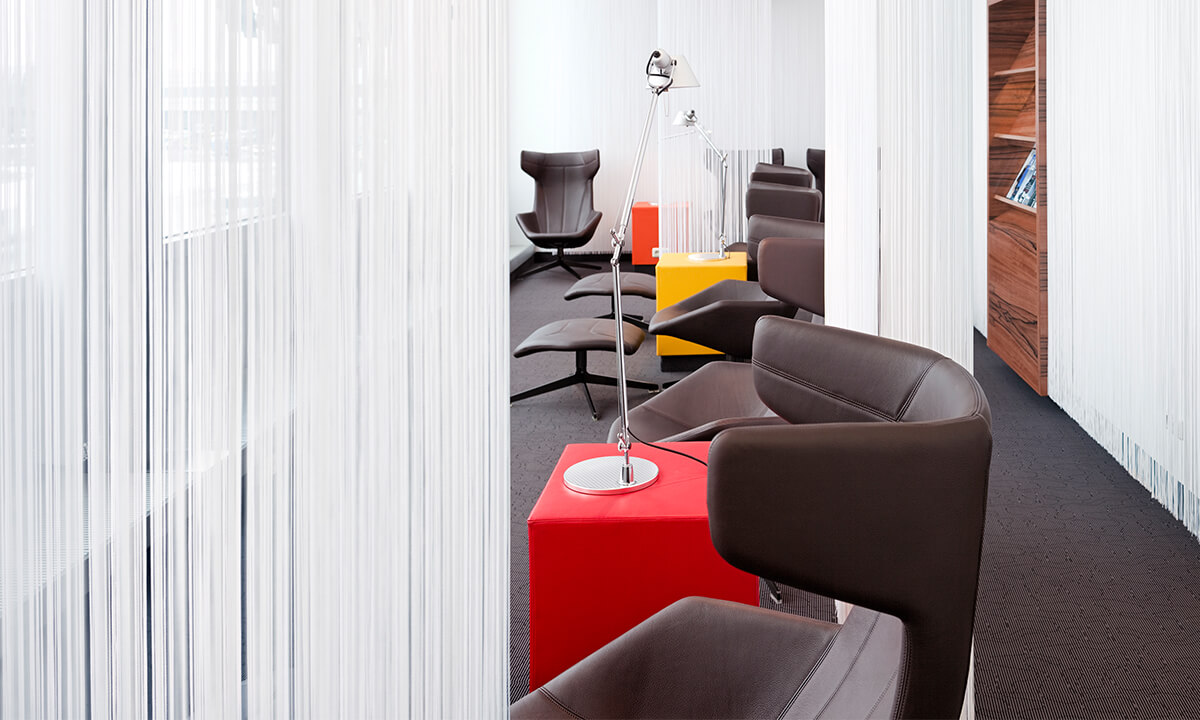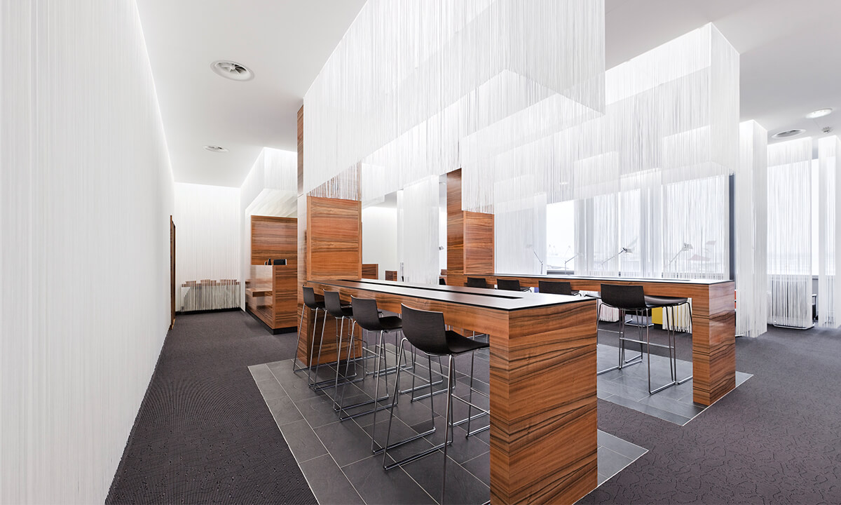 Die einzelnen Bereiche der rund 270m2 großen Lounge werden durch die Gruppierung der Möbel und mittels eines durchlässigen Filters in Form eines Schnur-Vorhanges begrenzt und definiert. Dadurch sind die unterschiedlichen Nutzungsbereiche zwar klar ablesbar, aber zugleich sind auch ein guter Überblick und ein hohes Maß an Orientierbarkeit gegeben. Der Raum bleibt in seiner Gesamtheit ablesbar und verständlich; zugleich entsteht aber in den einzelnen Raumzonierungen ein hohes Maß an Privatheit. Diese nimmt vom Eingang aus zum Ende des Raumes zu. Personen mit kurzer Aufenthaltsdauer halten sich eher im vorderen Bereich auf, Passagiere mit längerer Aufenthaltsdauer eher im hinteren ruhigeren Bereich. (Text: Architekten)
