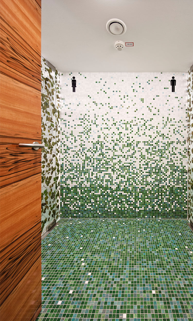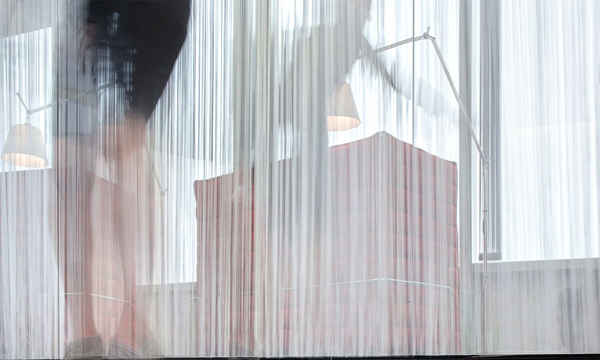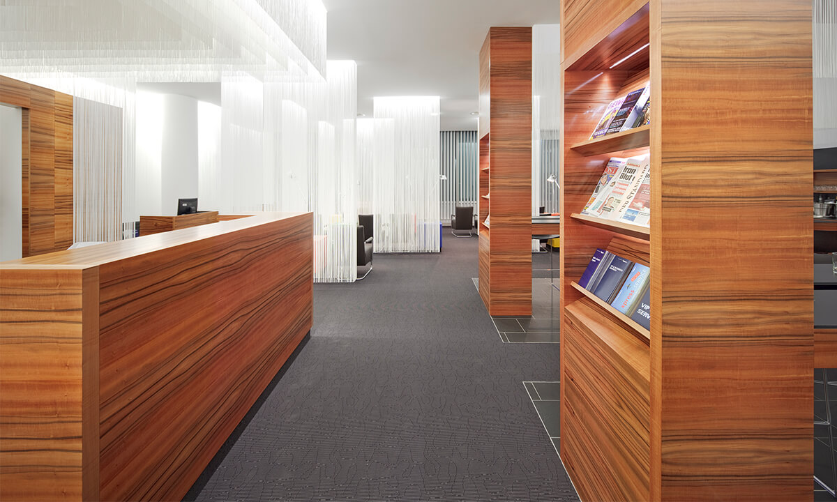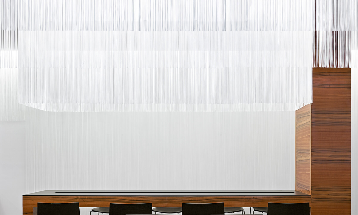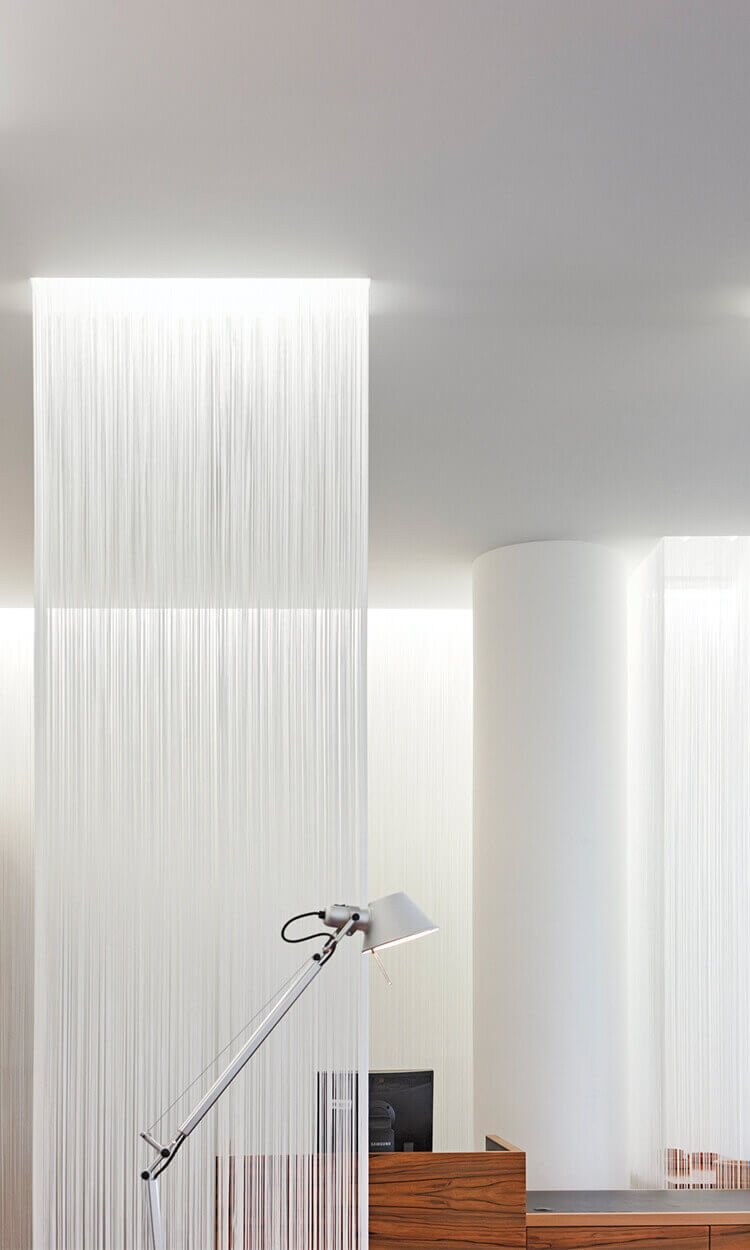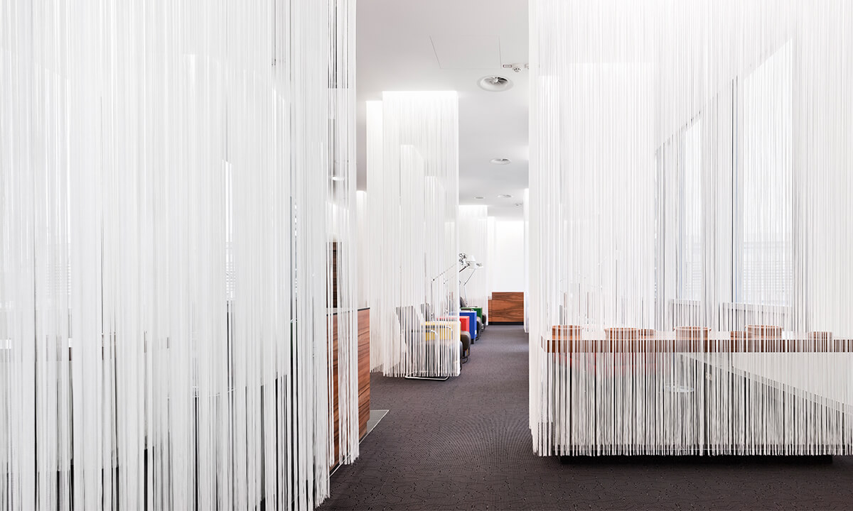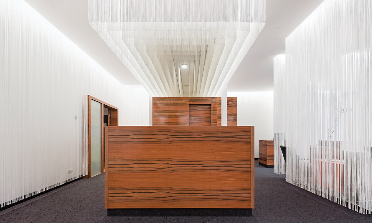 Die einzelnen Bereiche der rund 270m2 großen Lounge werden durch die Gruppierung der Möbel und mittels eines durchlässigen Filters in Form eines Schnur-Vorhanges begrenzt und definiert. Dadurch sind die unterschiedlichen Nutzungsbereiche zwar klar ablesbar, aber zugleich sind auch ein guter Überblick und ein hohes Maß an Orientierbarkeit gegeben. Der Raum bleibt in seiner Gesamtheit ablesbar und verständlich; zugleich entsteht aber in den einzelnen Raumzonierungen ein hohes Maß an Privatheit. Diese nimmt vom Eingang aus zum Ende des Raumes zu. Personen mit kurzer Aufenthaltsdauer halten sich eher im vorderen Bereich auf, Passagiere mit längerer Aufenthaltsdauer eher im hinteren ruhigeren Bereich. (Text: Architekten)
