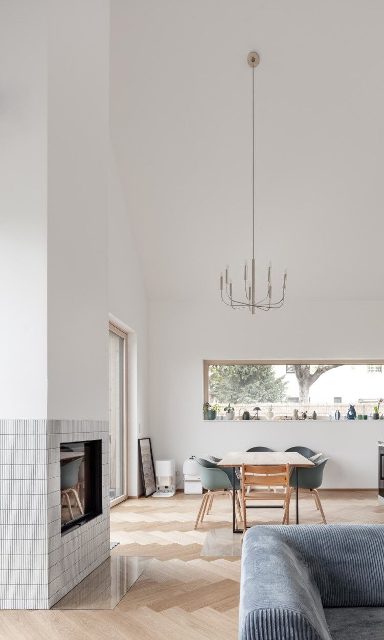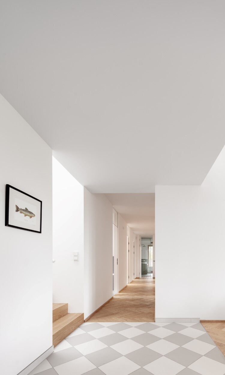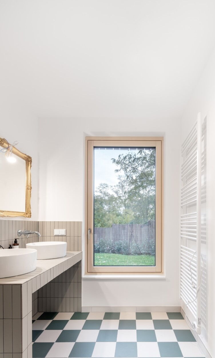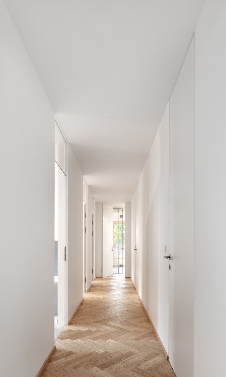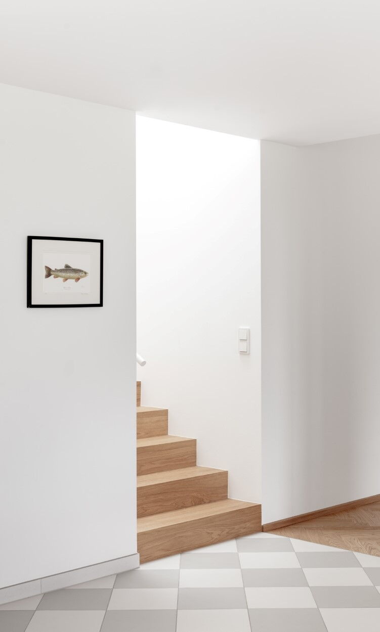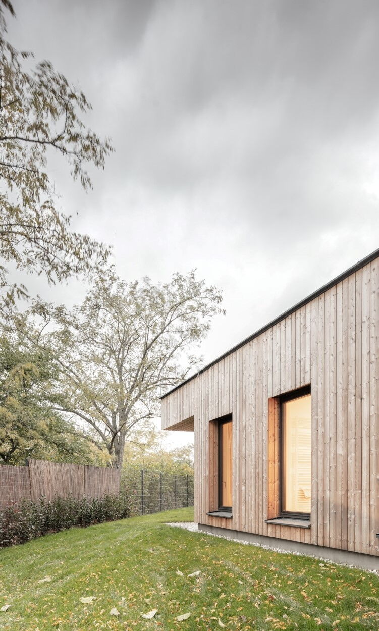 Der Neubau wurde so positioniert, dass anstelle der vorherigen drei Restflächen eine große zusammenhängende Gartenfläche entstand. Diese orientiert sich in Richtung der daneben fließenden Schwechat und somit sind von der Terrasse und vom Garten so gut wie keine Nachbargebäude zu sehen. In diese Richtung öffnet sich das Haus; zu dem direkten Nachbarn auf der gegenüberliegenden Seite bleibt es relativ geschlossen.