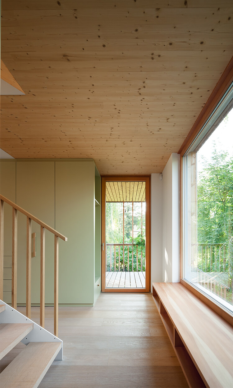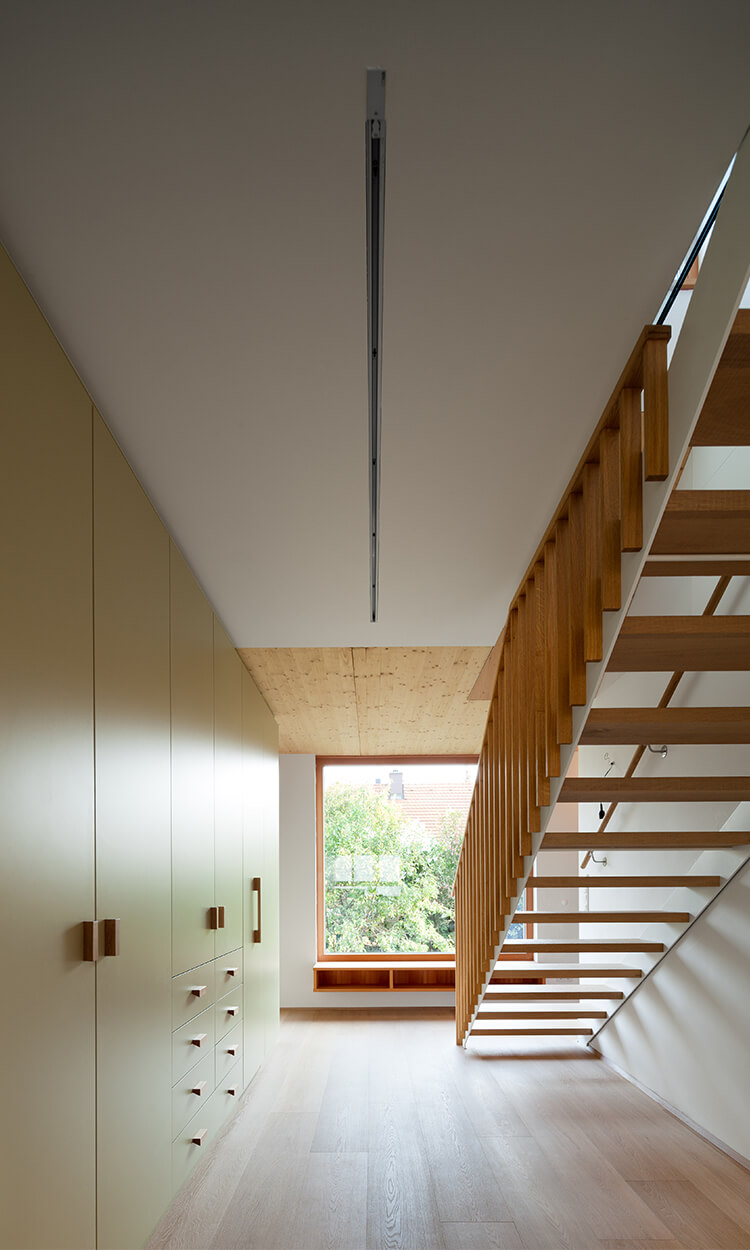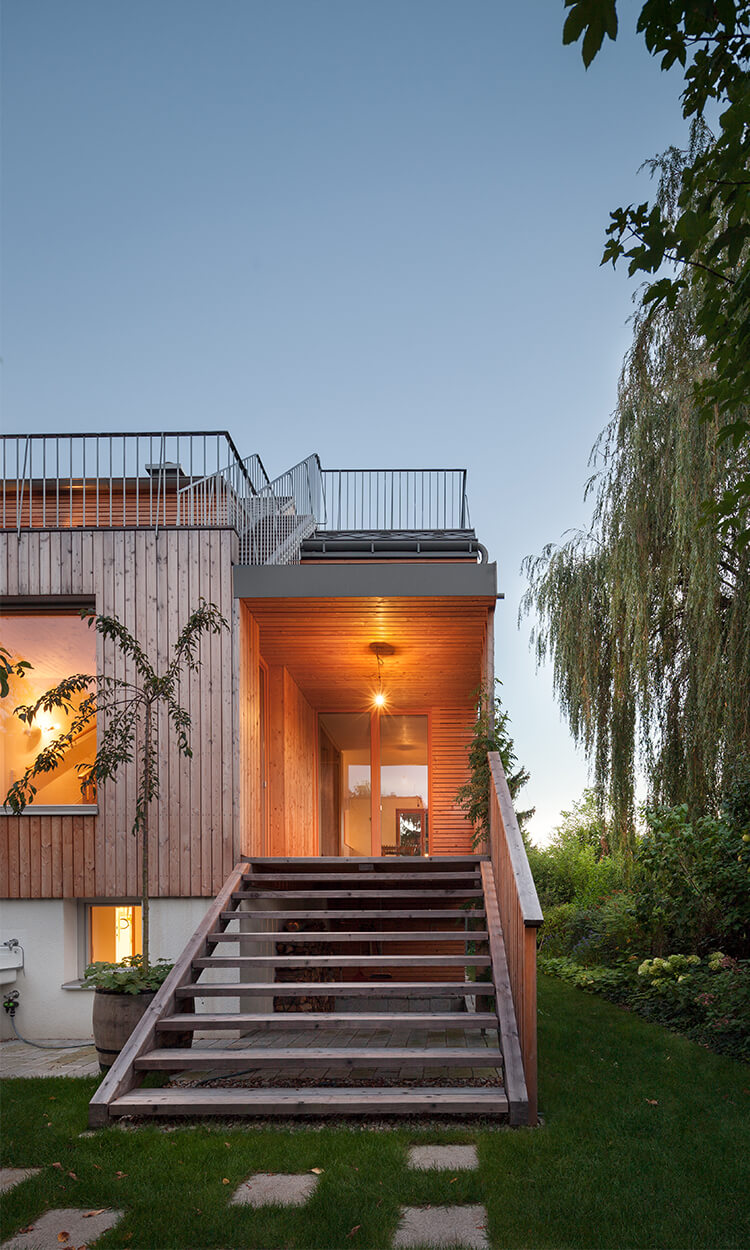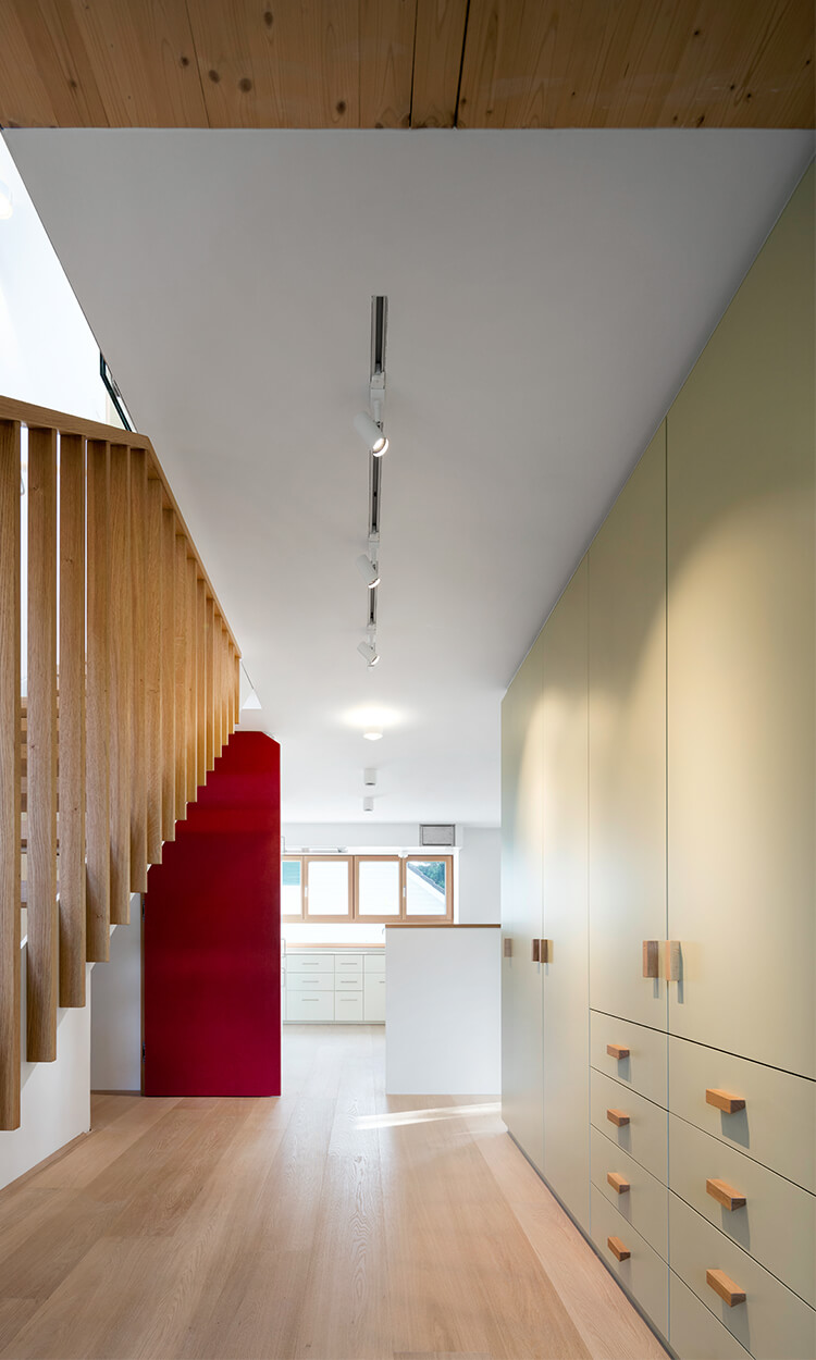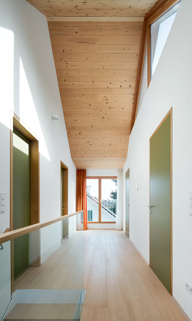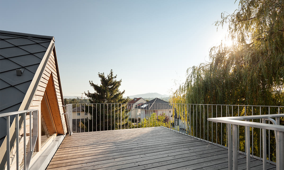 Das Dach des westseitigen Zubaus ist teilweise als Flachdach ausgebildet. Dadurch konnte eine 2. sehr hoch liegende Terrasse mit Fernblick sowie beim Übergang zum Steildach ein großes Giebelfenster geschaffen werden, welches den Gang und den Stiegenbereich belichtet. Im Bereich des Steildaches wurden in den beiden ostseitigen Schlafzimmern Galerieebenen eingezogen.