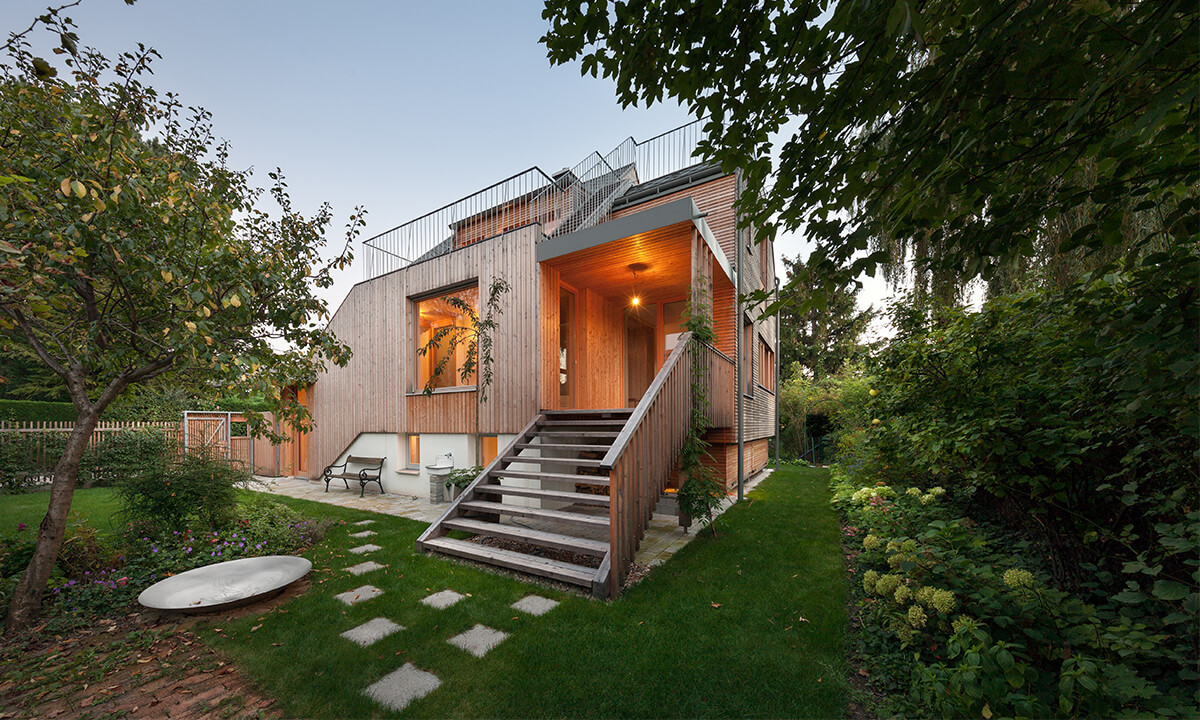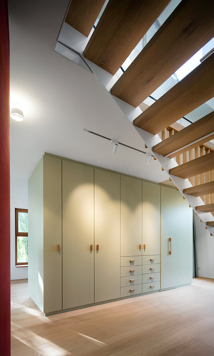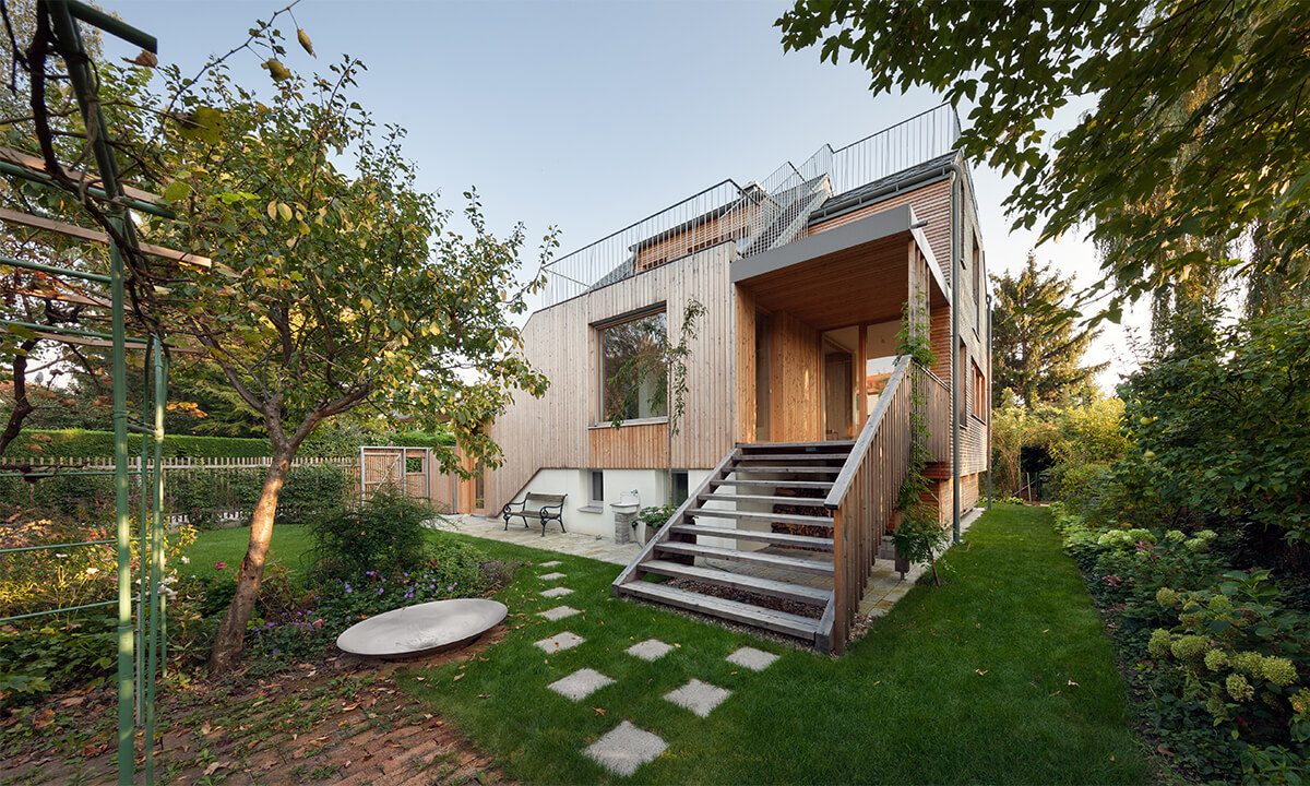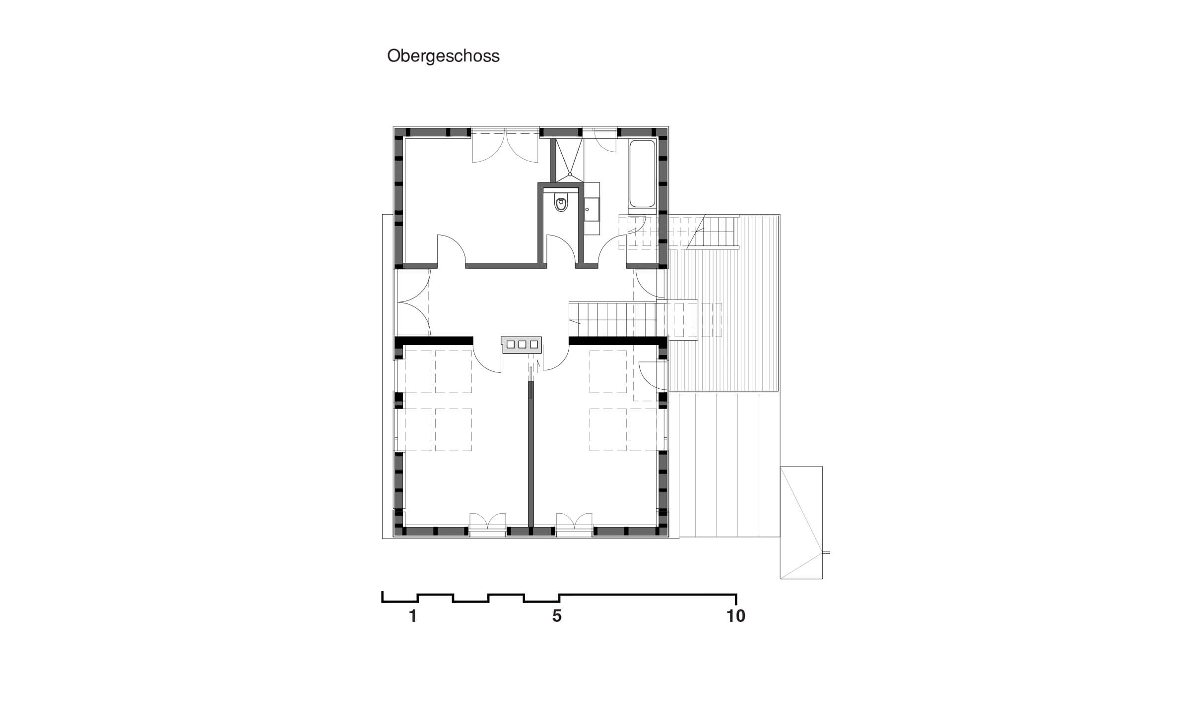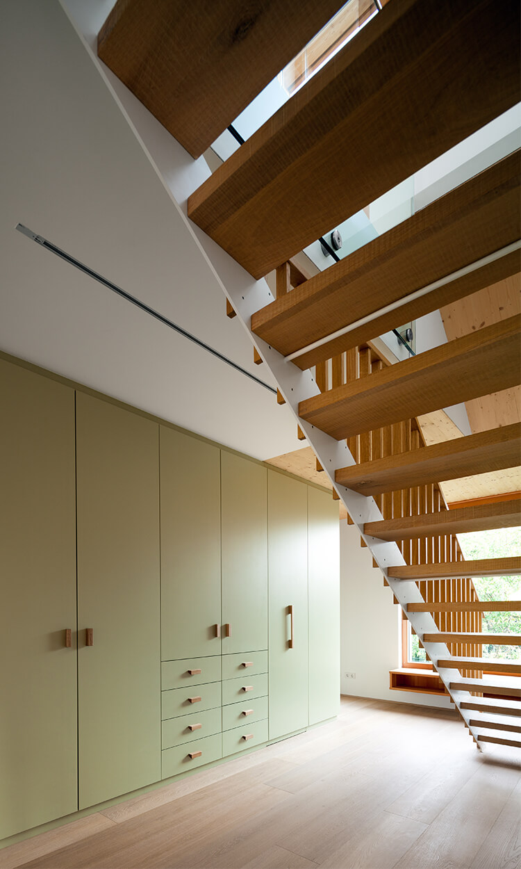 Das Dach des westseitigen Zubaus ist teilweise als Flachdach ausgebildet. Dadurch konnte eine 2. sehr hoch liegende Terrasse mit Fernblick sowie beim Übergang zum Steildach ein großes Giebelfenster geschaffen werden, welches den Gang und den Stiegenbereich belichtet. Im Bereich des Steildaches wurden in den beiden ostseitigen Schlafzimmern Galerieebenen eingezogen.