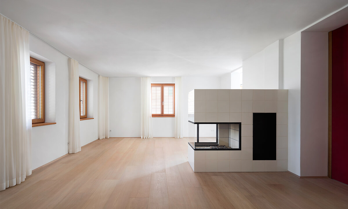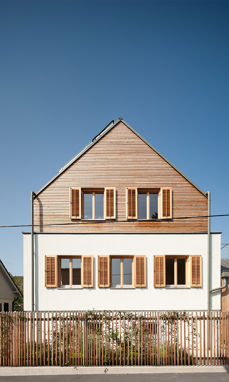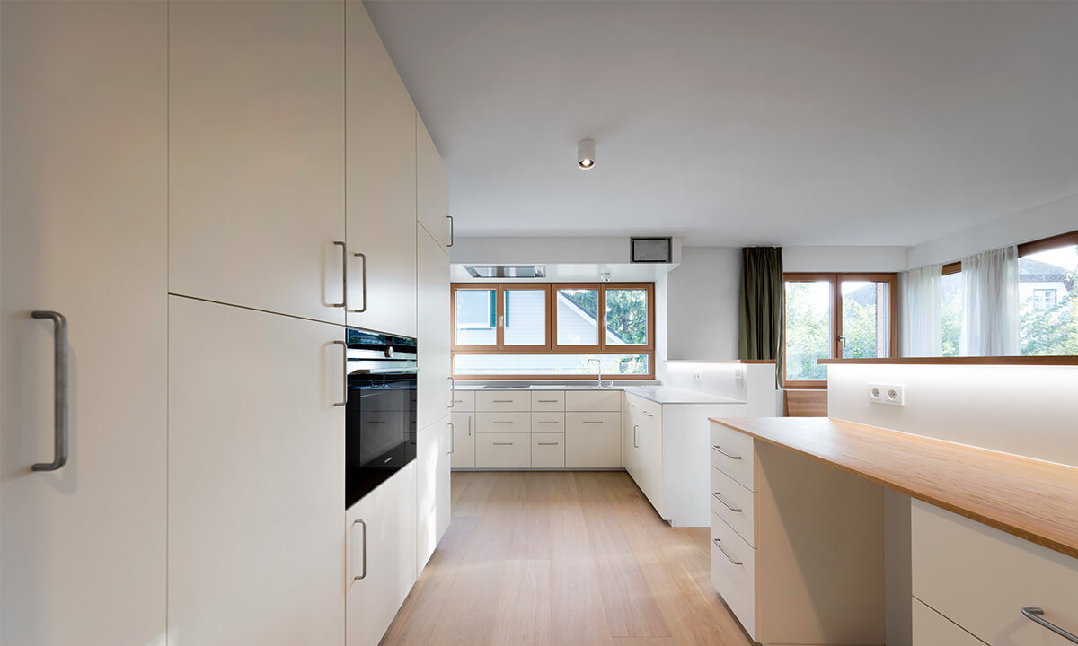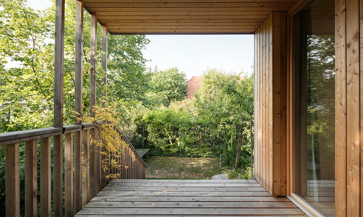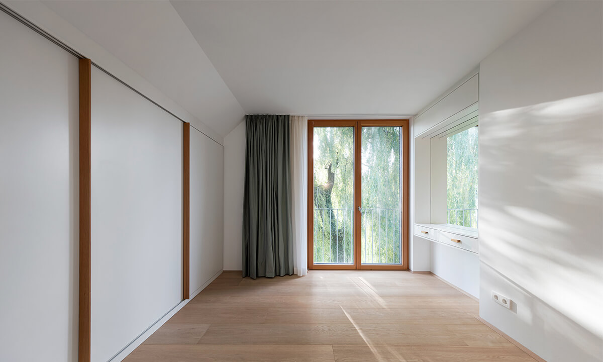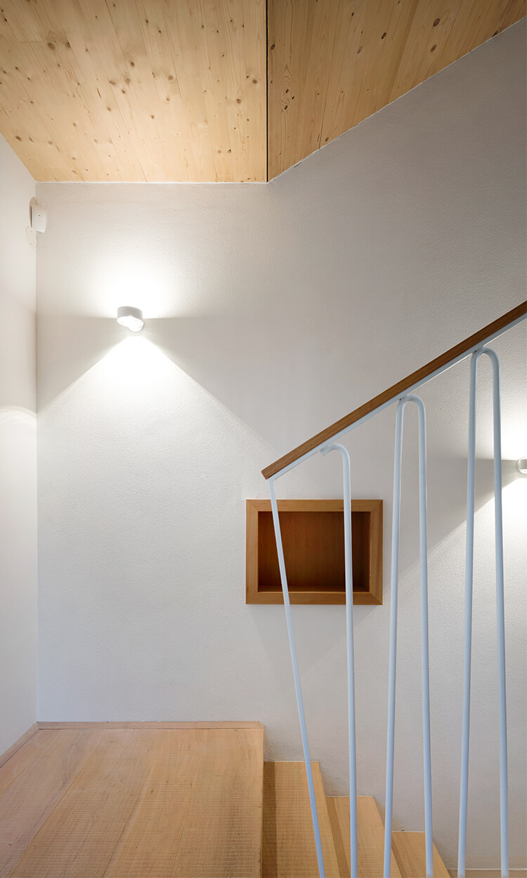 Das Dach des westseitigen Zubaus ist teilweise als Flachdach ausgebildet. Dadurch konnte eine 2. sehr hoch liegende Terrasse mit Fernblick sowie beim Übergang zum Steildach ein großes Giebelfenster geschaffen werden, welches den Gang und den Stiegenbereich belichtet. Im Bereich des Steildaches wurden in den beiden ostseitigen Schlafzimmern Galerieebenen eingezogen.
