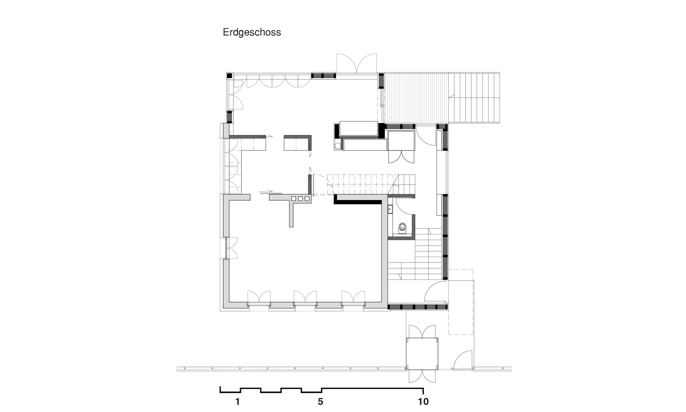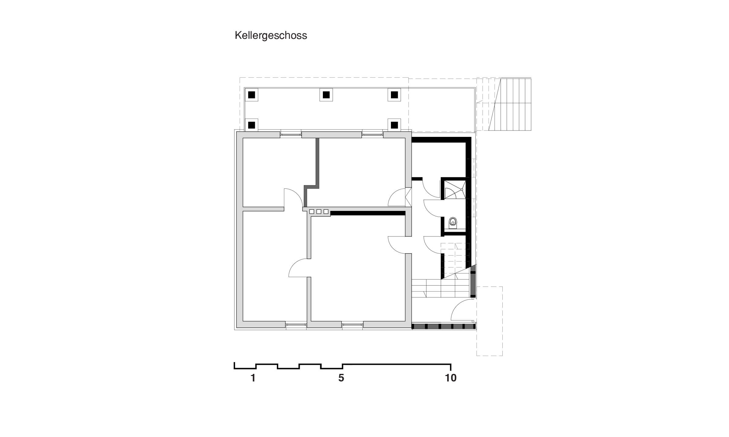 Von dem relativ kleinen Gebäude aus den 1950er Jahren wurden der Keller, Teile des Erdgeschoßes, sowie die Decke über EG erhalten.