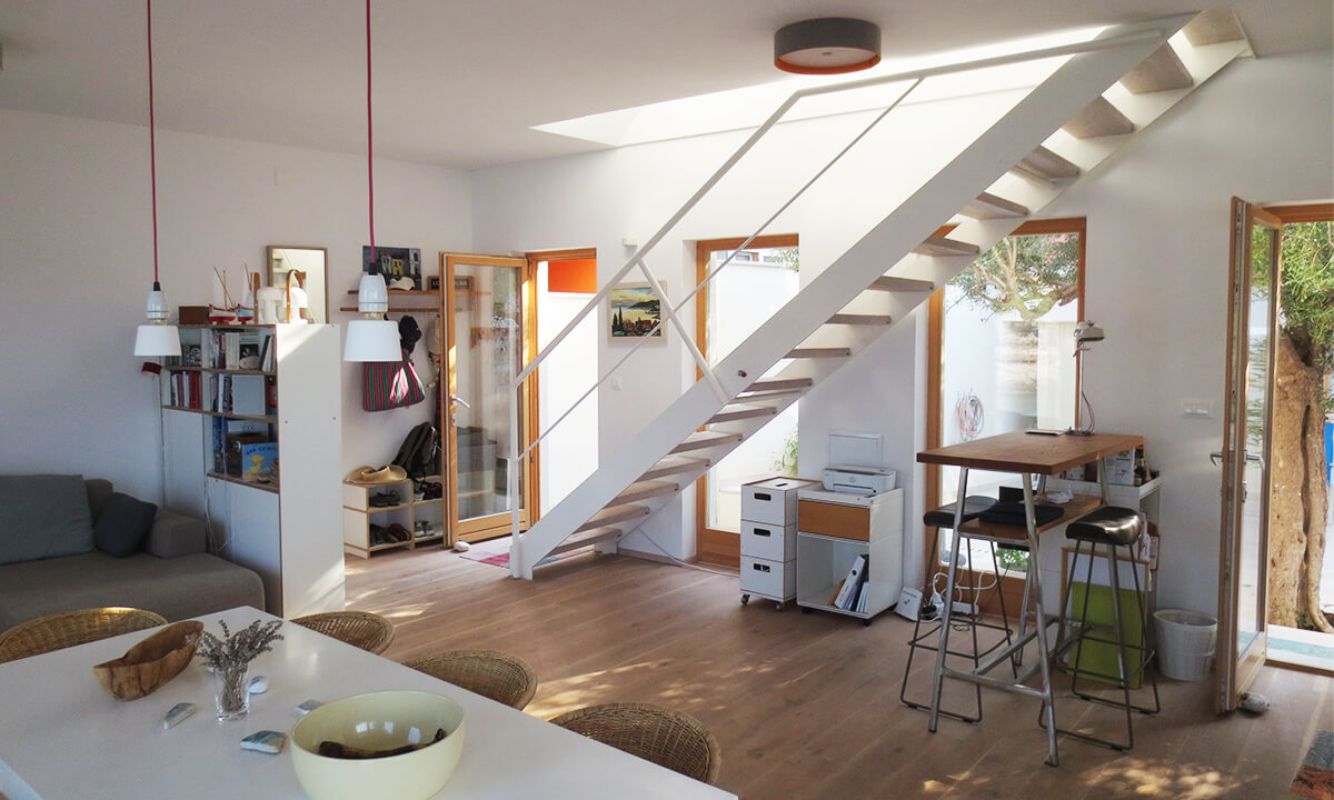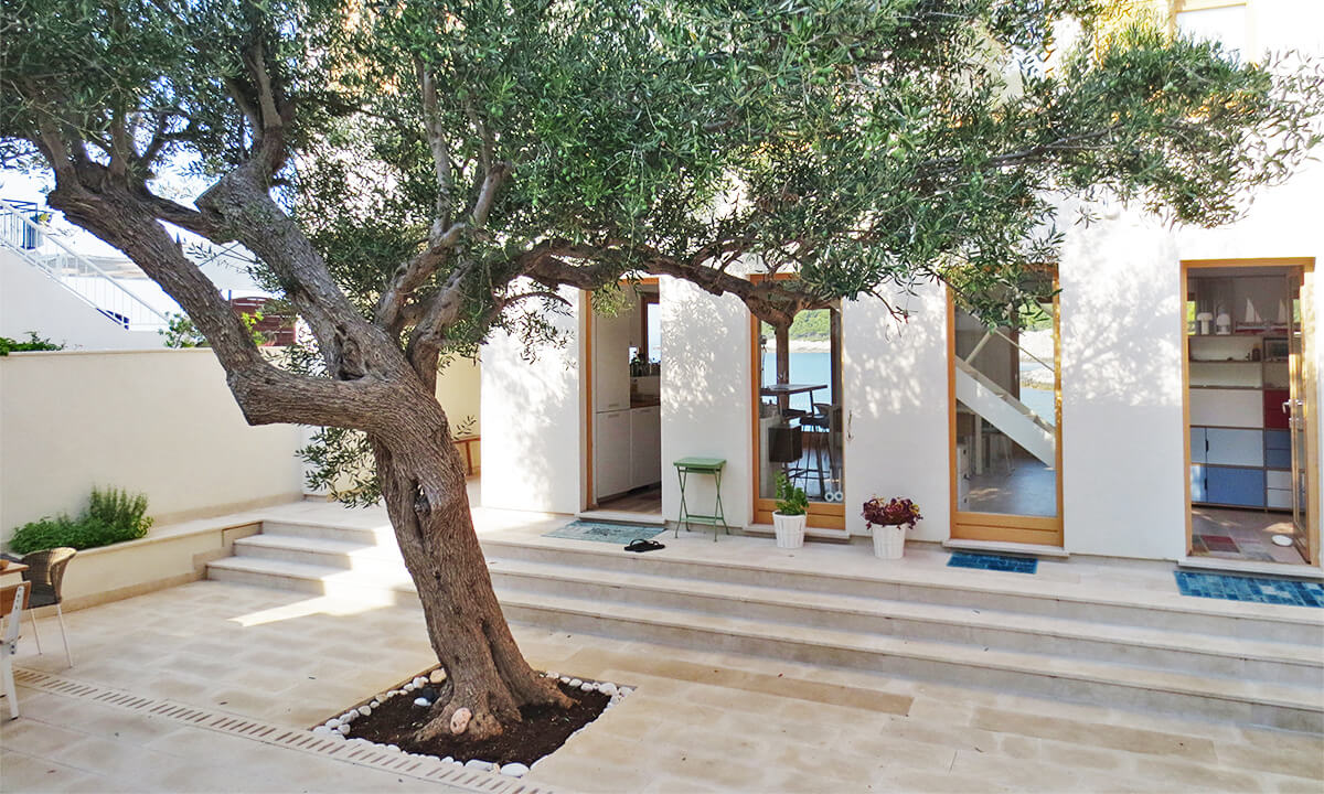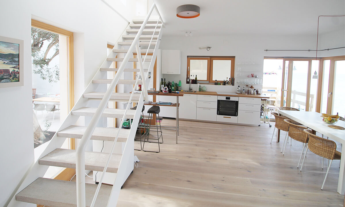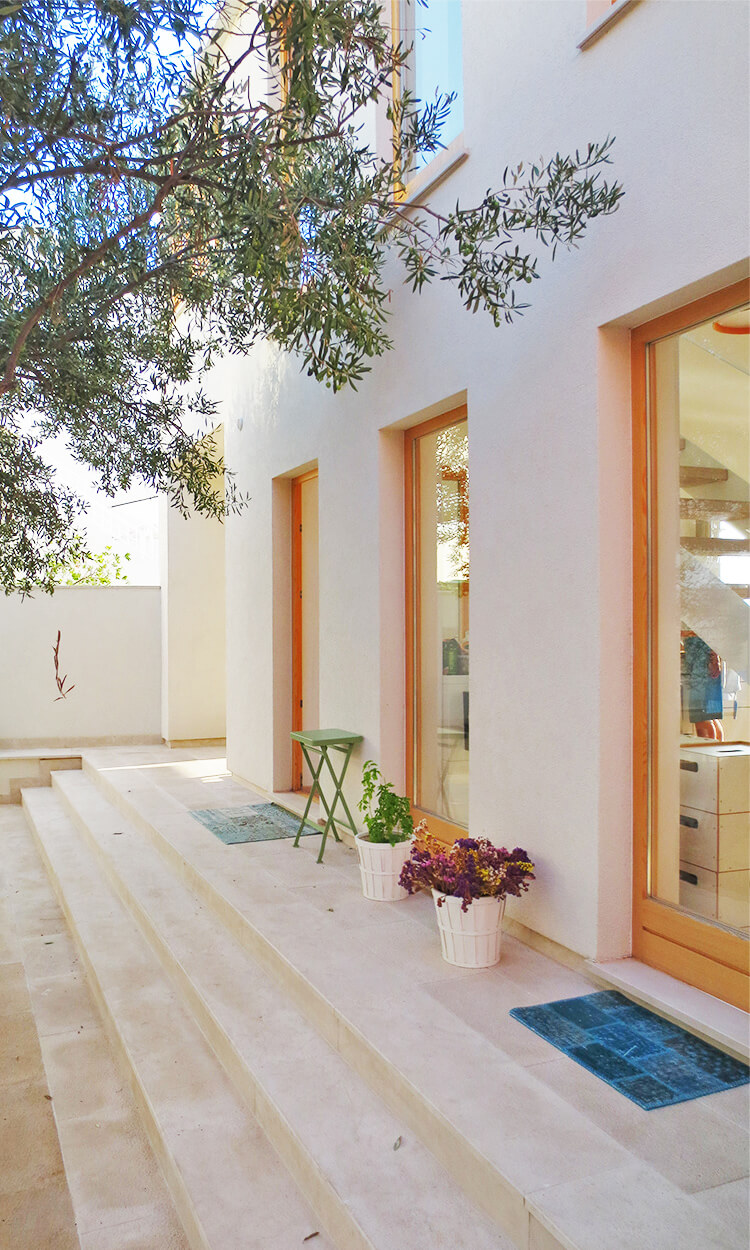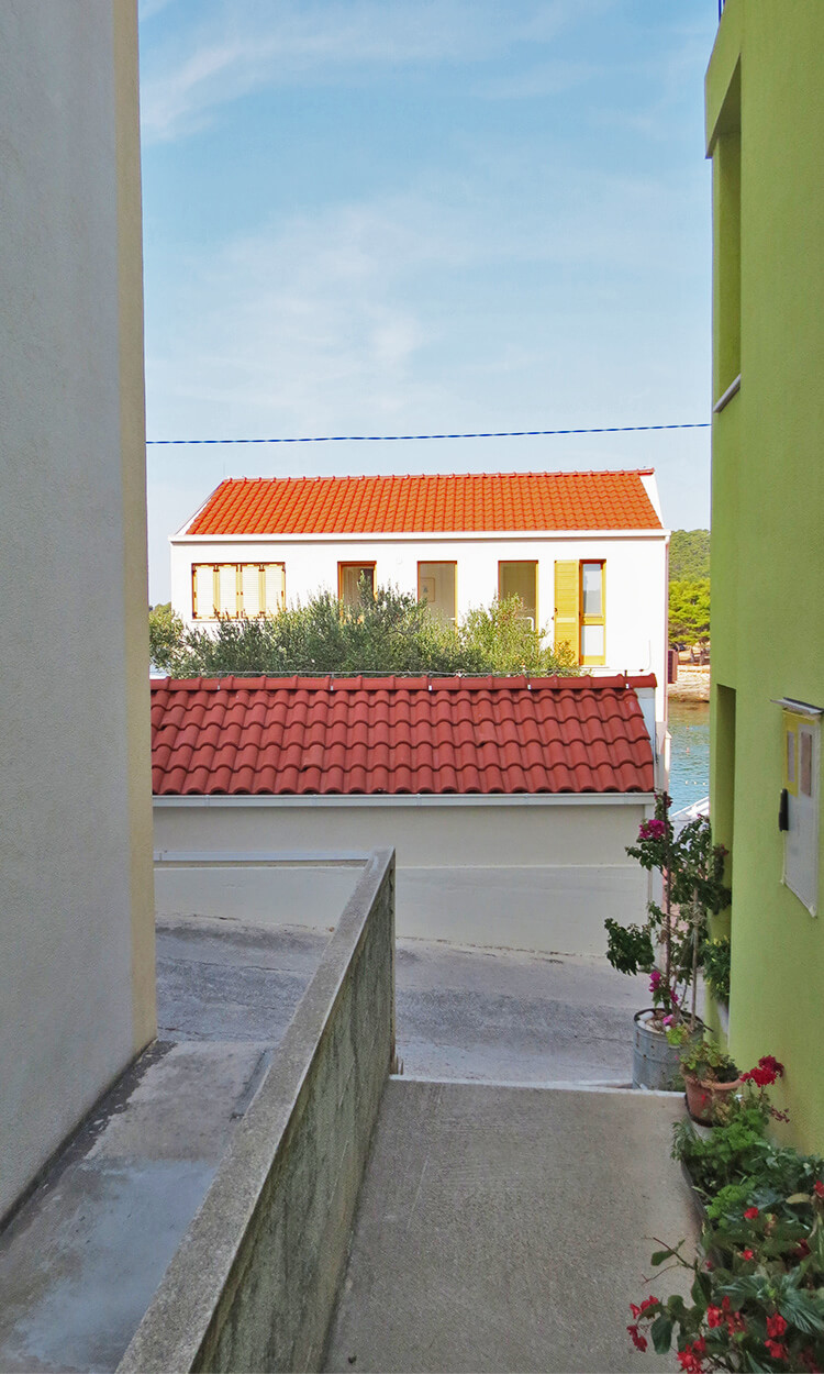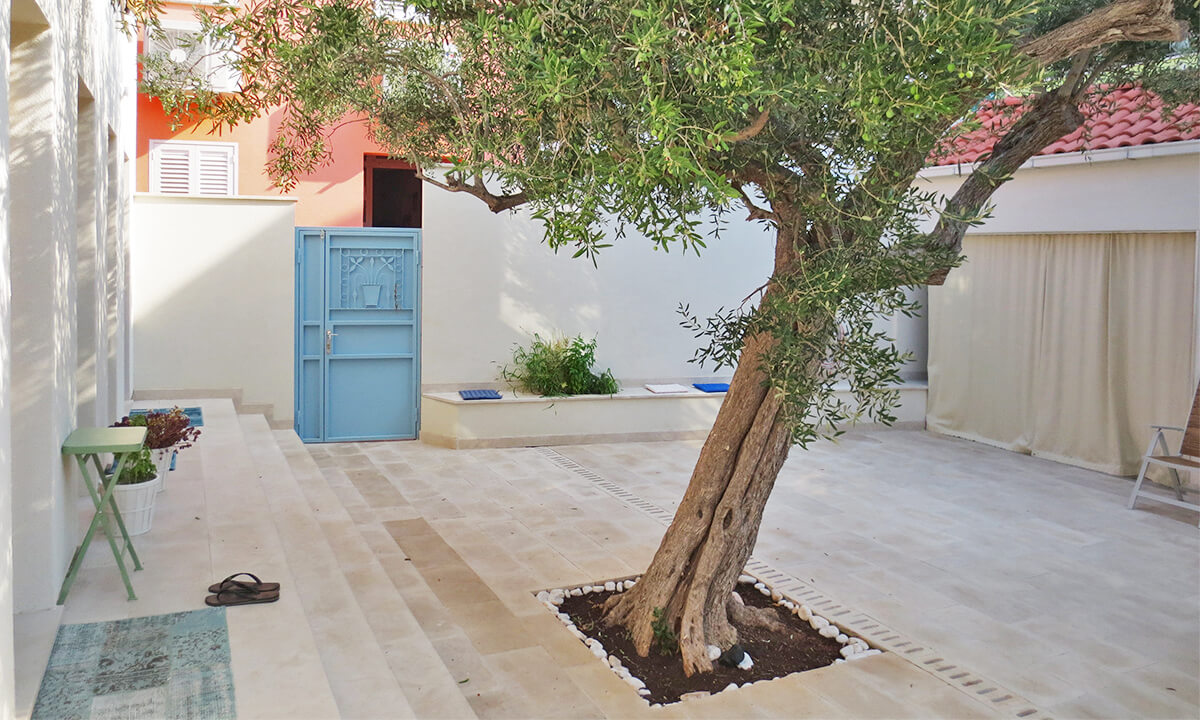Im Souterrain bzw. dem Erdgeschoß Richtung Straßenniveau entstand eine Art Einliegerwohnung für Gäste mit eigenem Bad und kleiner Kochgelegenheit. Der erste Stock befindet sich auf der Höhe des, über eine kleine Seitenstraße erreichbaren, Hofs. Ein großer Wohn-Ess-Raum öffnet sich nach drei Seiten. Zum Hof, zu einer überdeckten Terrasse und Richtung Meer. An der Hinterseite des Hofes wurde ein Nebengebäude mit kleiner Wohneinheit errichtet. Im zweiten Stock des Haupthauses befinden sich 3 Zimmer und ein Bad. Alle Zimmer sind über einen durchgehenden Balkon verbunden.