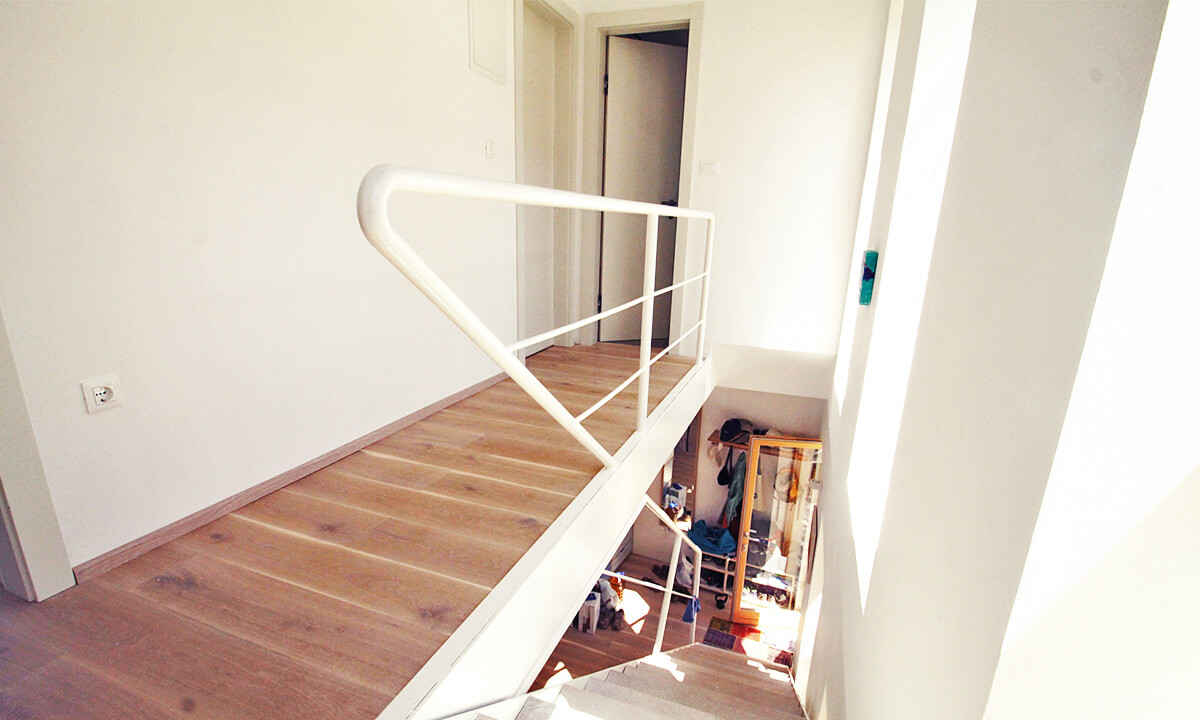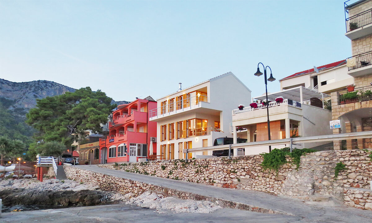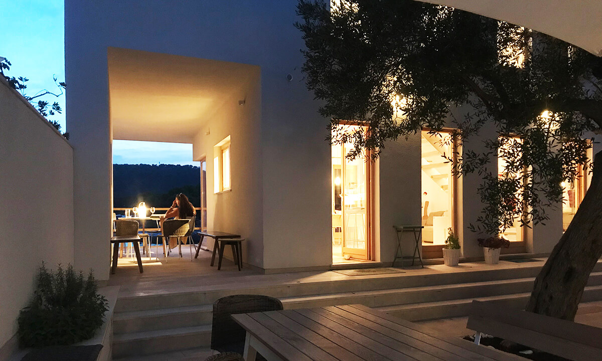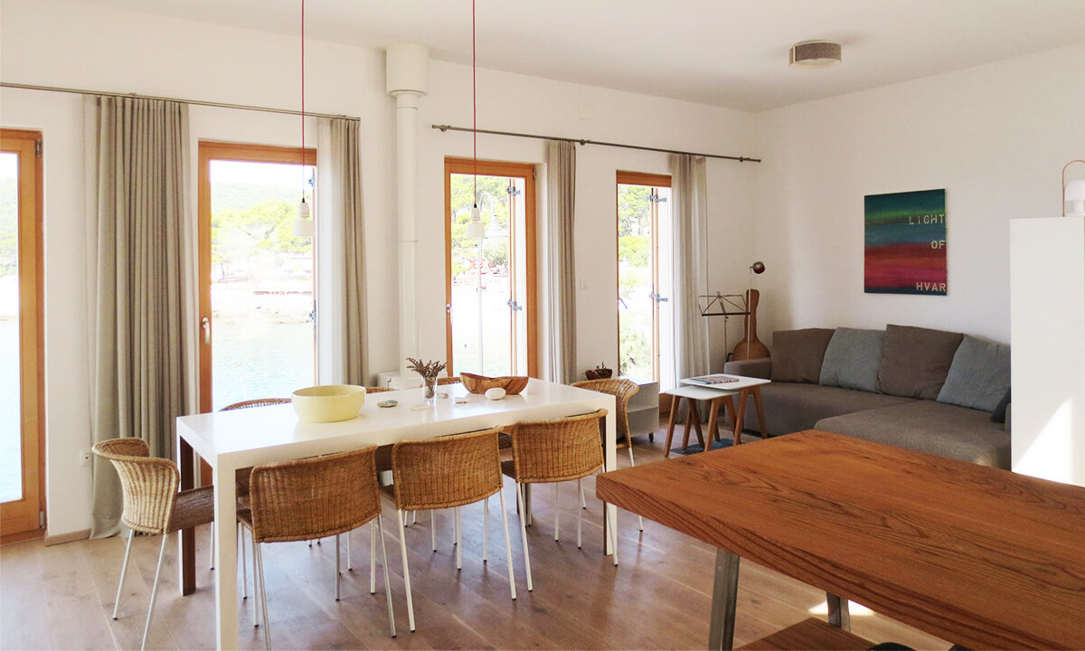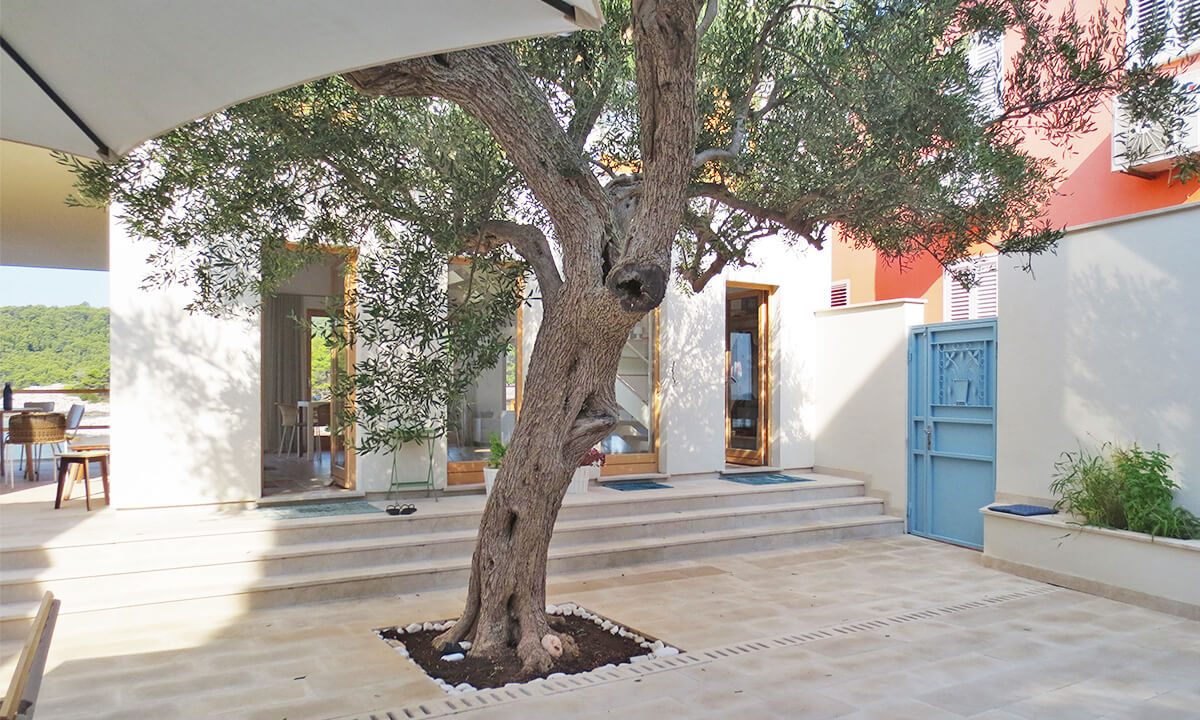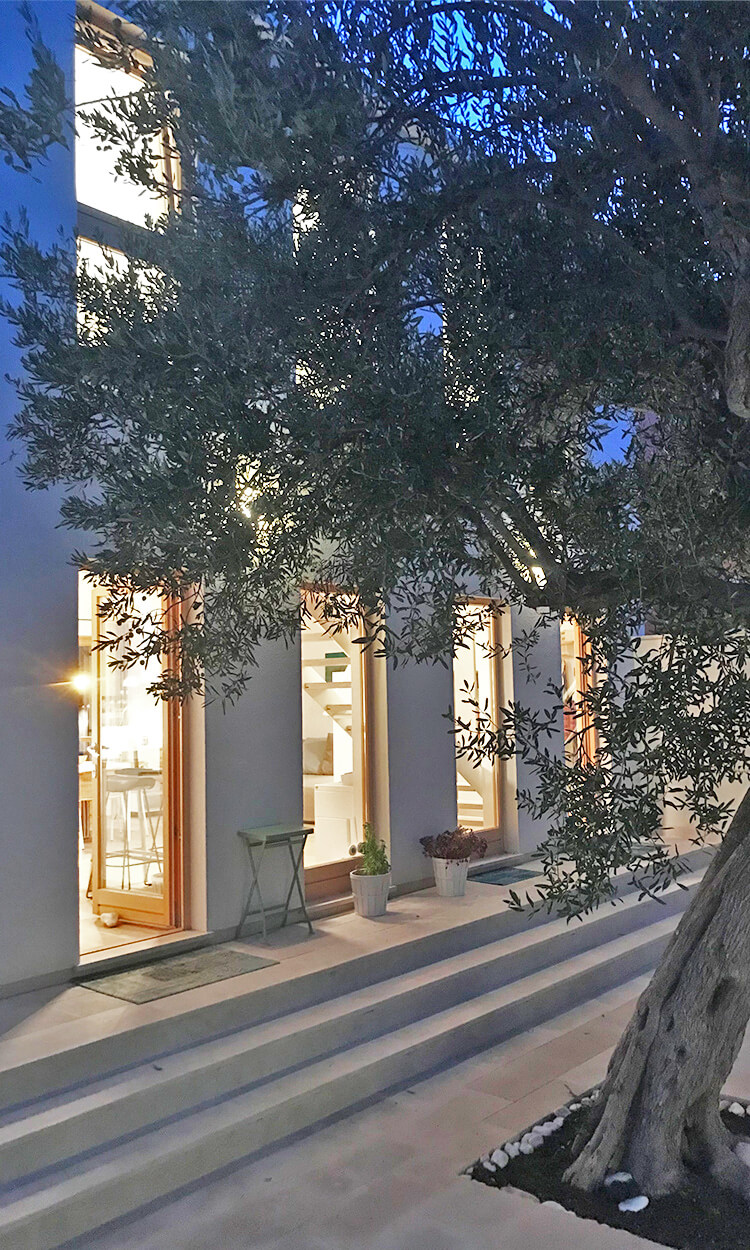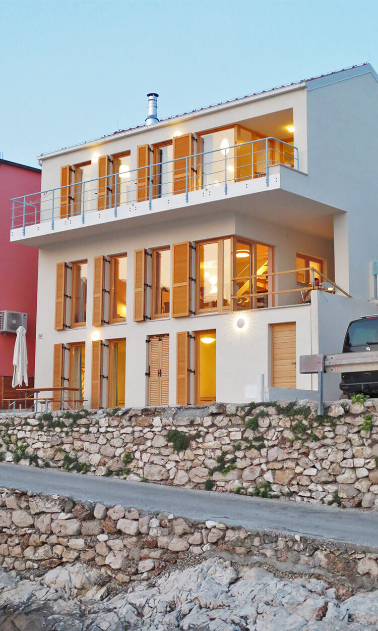 Im Souterrain bzw. dem Erdgeschoß Richtung Straßenniveau entstand eine Art Einliegerwohnung für Gäste mit eigenem Bad und kleiner Kochgelegenheit. Der erste Stock befindet sich auf der Höhe des, über eine kleine Seitenstraße erreichbaren, Hofs. Ein großer Wohn-Ess-Raum öffnet sich nach drei Seiten. Zum Hof, zu einer überdeckten Terrasse und Richtung Meer. An der Hinterseite des Hofes wurde ein Nebengebäude mit kleiner Wohneinheit errichtet. Im zweiten Stock des Haupthauses befinden sich 3 Zimmer und ein Bad. Alle Zimmer sind über einen durchgehenden Balkon verbunden.