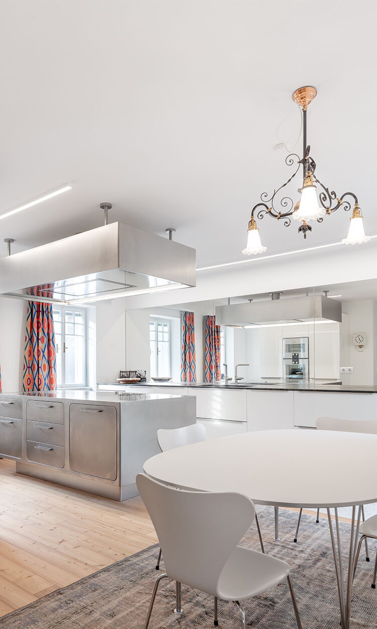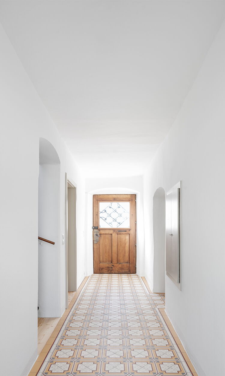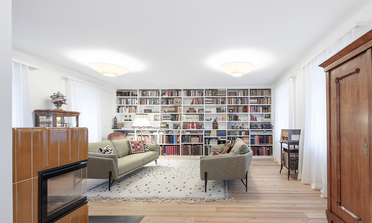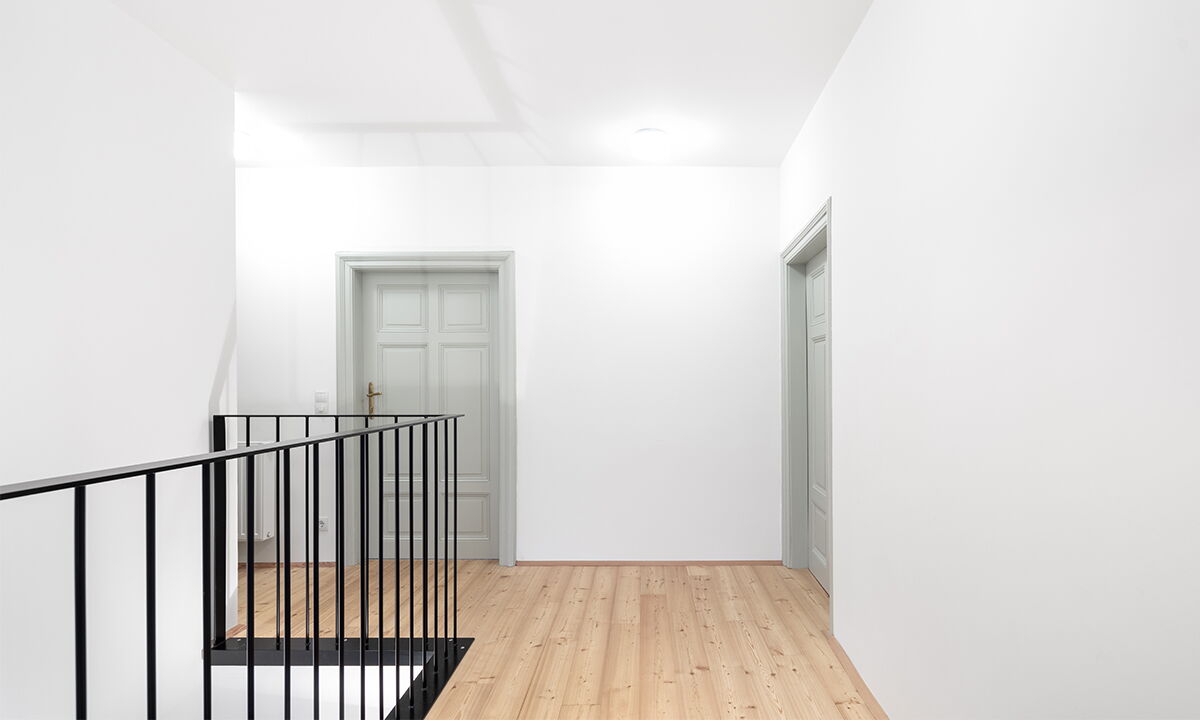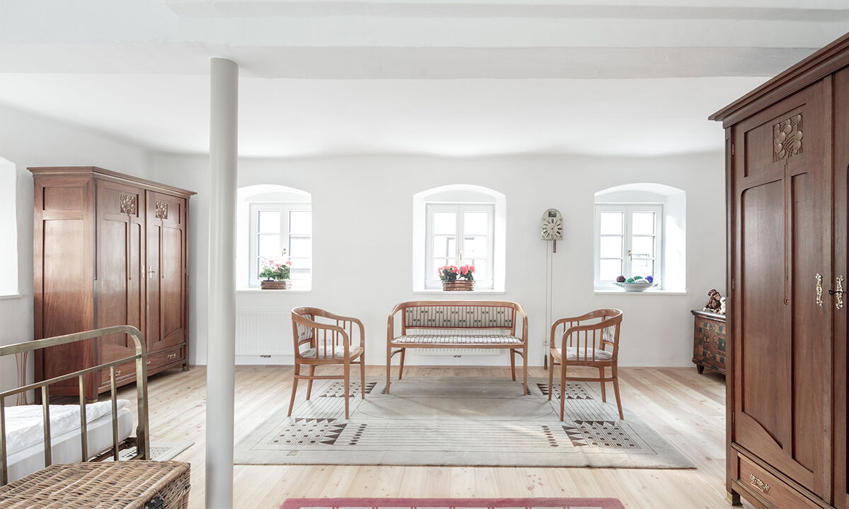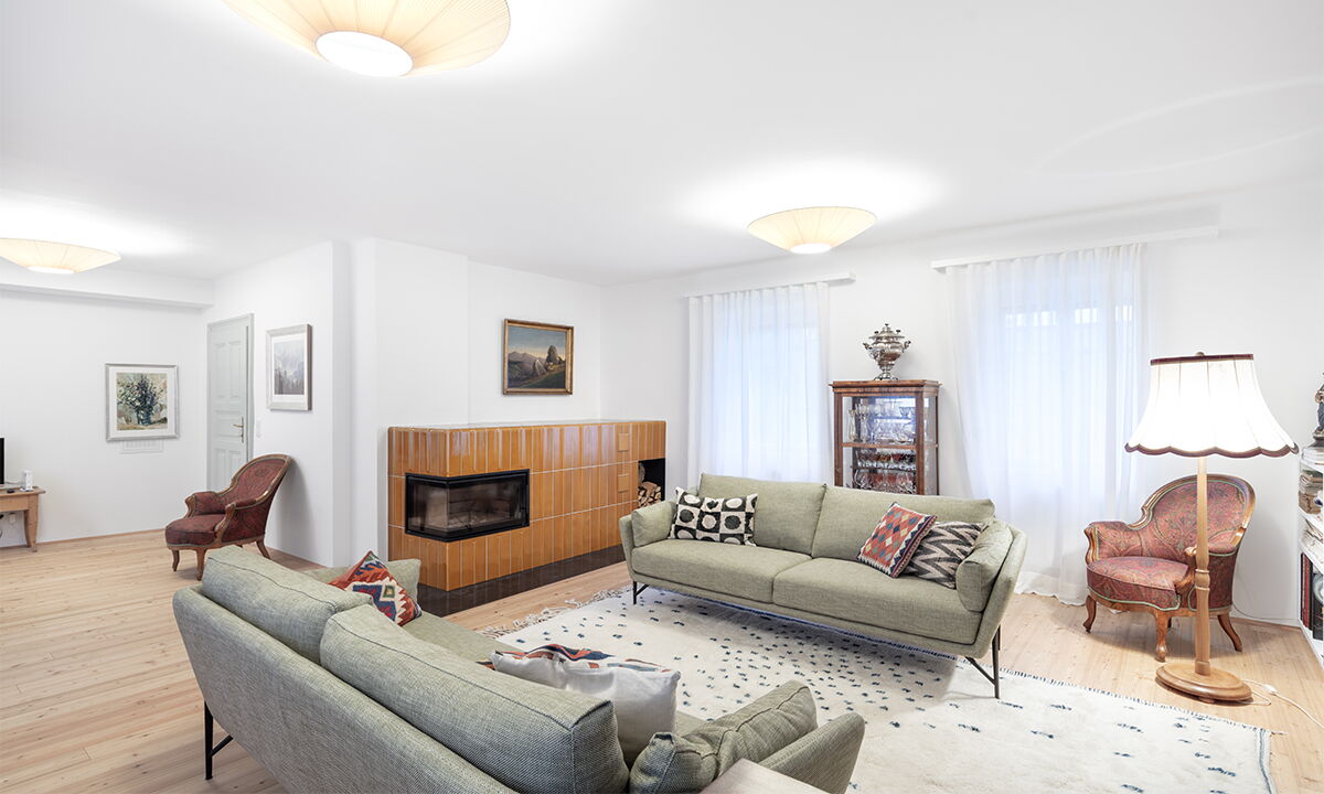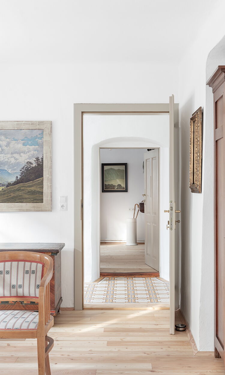 Sämtliche Oberflächen wurden erneuert. Die Böden sind als Lärchenvollholzböden auf Polsterhölzern mit dazwischenliegender Schafwolle ausgeführt.