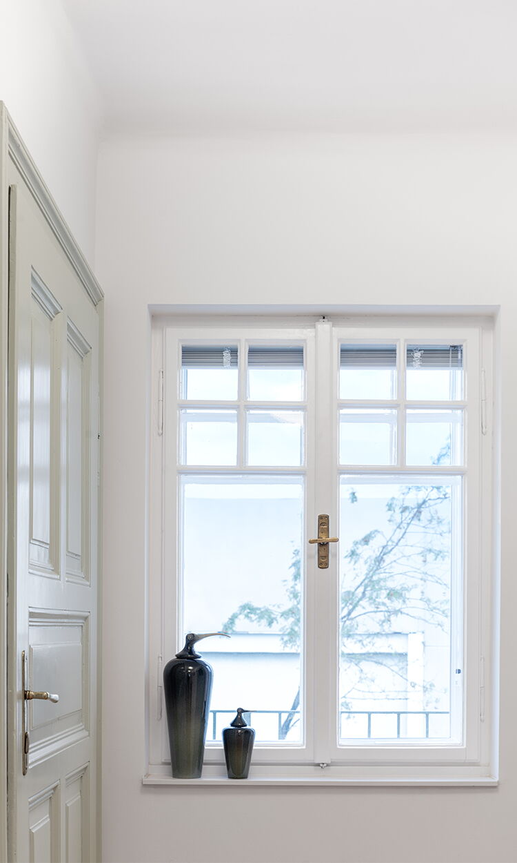 Die Fenster im Obergeschoß wurden saniert. Die Fenster im Erdgeschoß wurden gegen Holzfenster mit einer ähnlichen Teilung wie die Kastenfenster des Obergeschoßes getauscht.