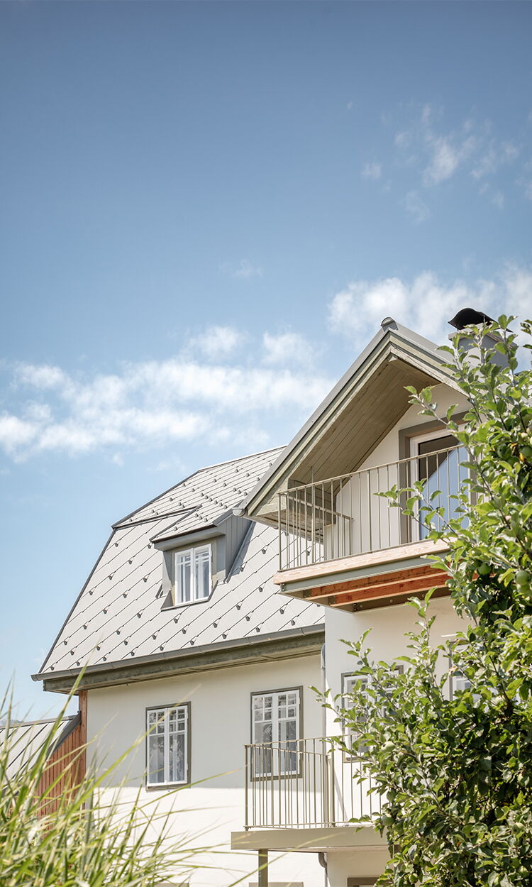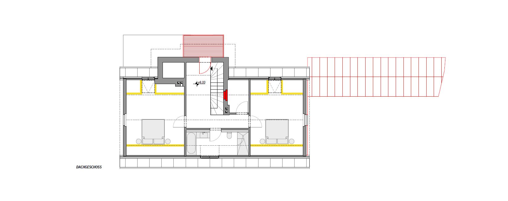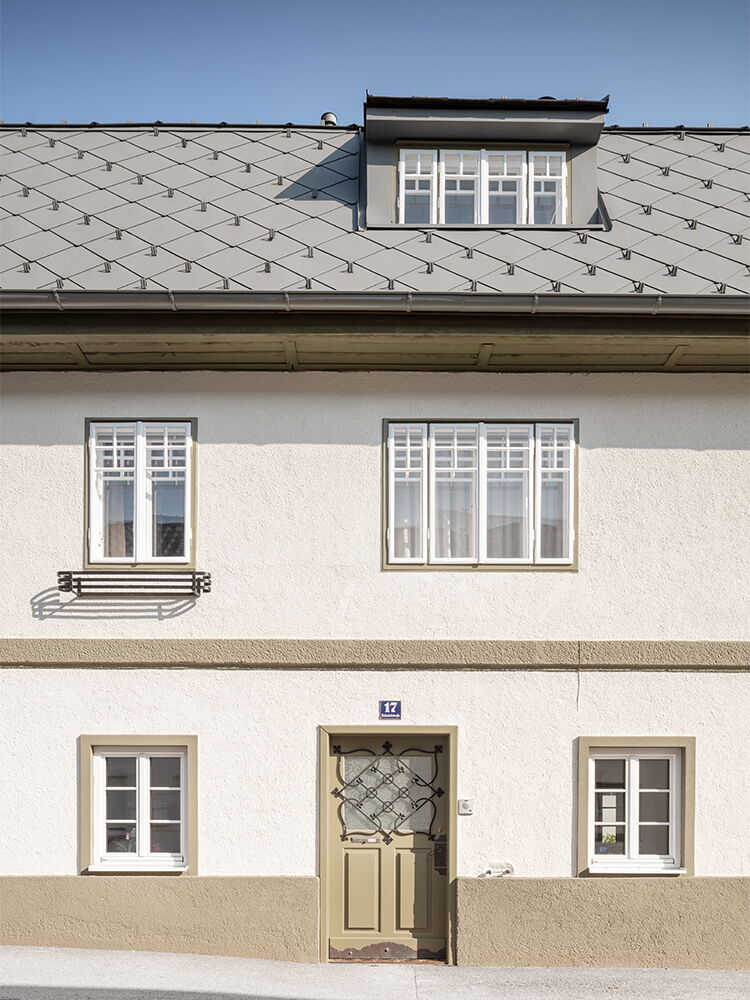 Im Dachgeschoß wurden die, nur geringfügig dämmenden, Heraklith-Innenwände entfernt. Dadurch konnte mehr Wohnraum für die beiden Schlafzimmer generiert werden. Auf dem bestehenden Dachstuhl wurde ein hinterlüfteter Dachaufbau mit einer Aluminiumeindeckung umgesetzt. Das bisher nicht gedämmte Dach erhielt eine Zwischensparrendämmung. Im Dachgeschoß wurde ein Badezimmer eingebaut.