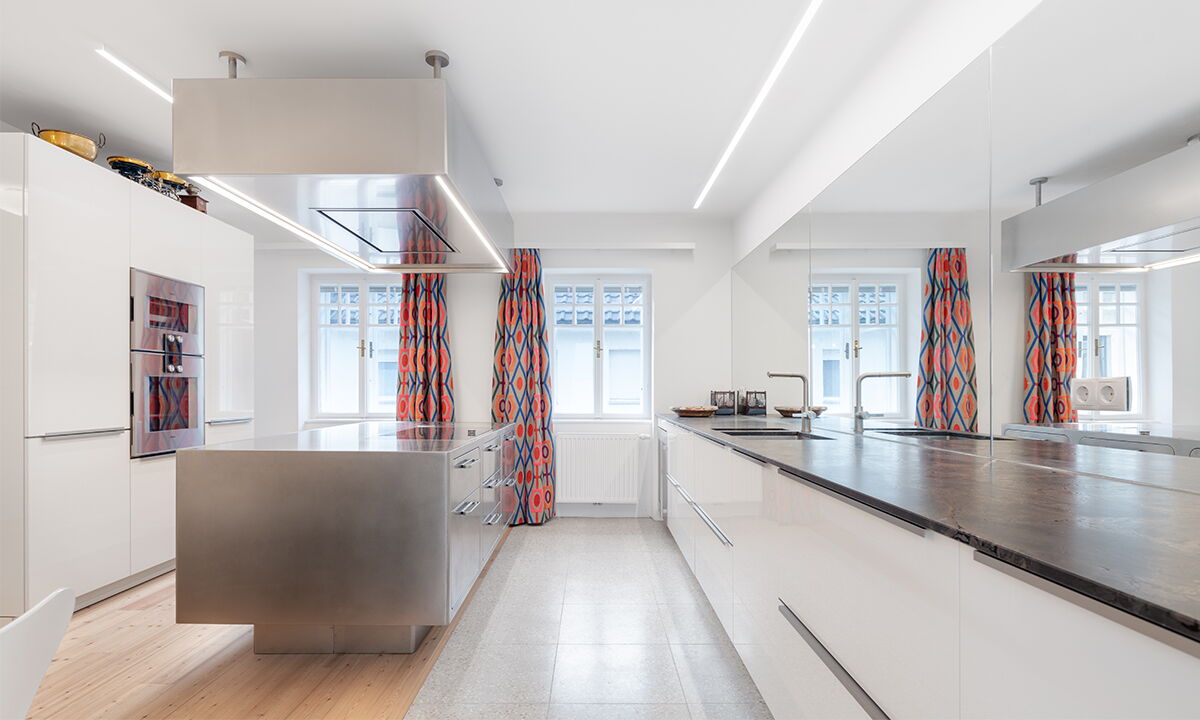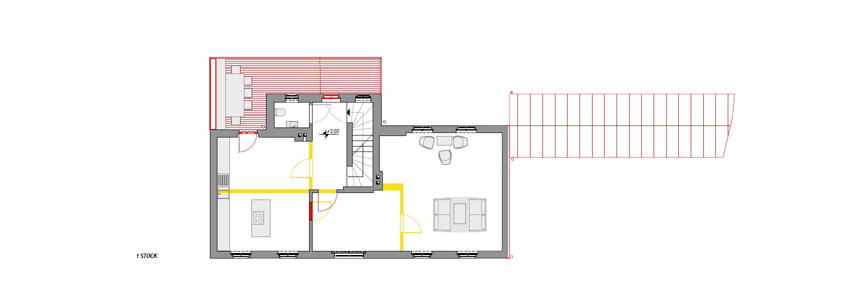 Im Obergeschoß wurden einige nichttragende Zwischenwände entfernt und die Raumaufteilung adaptiert. Dadurch entstanden 2 große Räume. Ein Wohnbereich mit einem neuen Kachelofen, sowie eine Küche mit direktem Zugang zu der neuen gartenseitigen Terrasse.