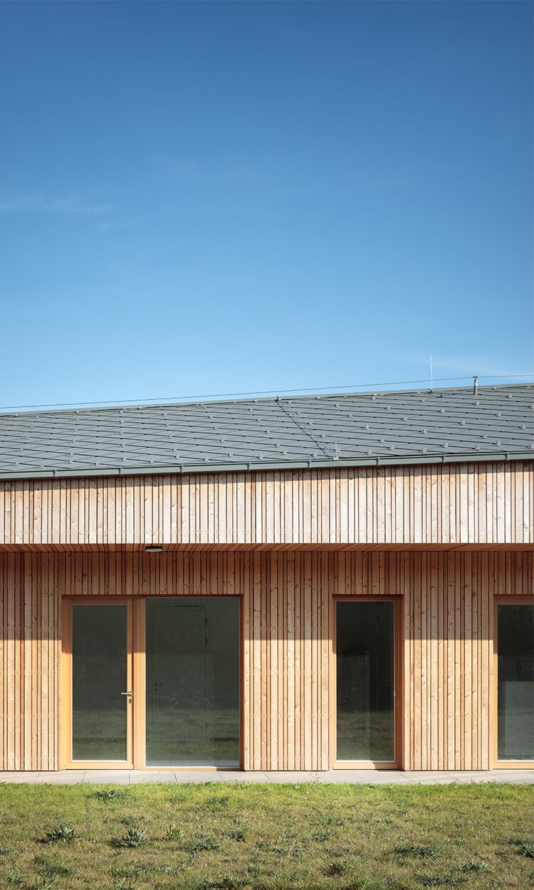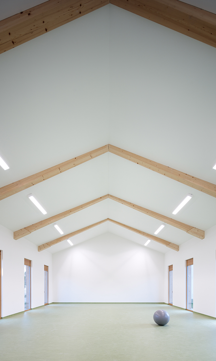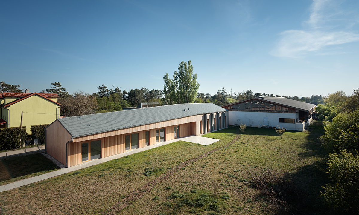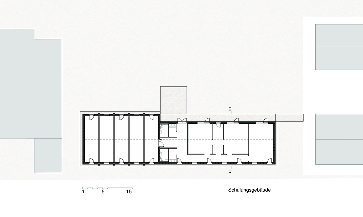 Detailbeschreibung: Das Schulungsgebäude wurde so positioniert, dass einerseits die gewünschte Abgrenzung Richtung östlichen Nachbarn erfolgte und andererseits die Wiese in Kombination mit dem Tagesgruppengebäude zum zentralen „Platz“ des Baukörperensembles gefasst wurde.