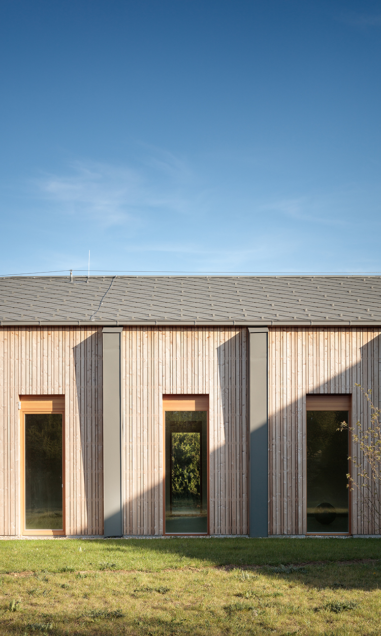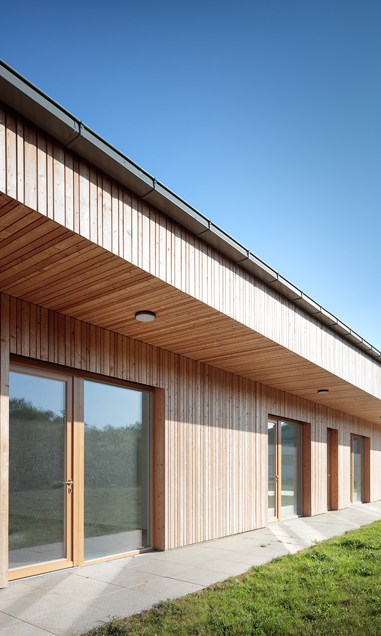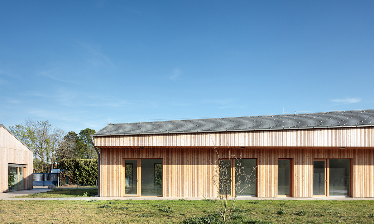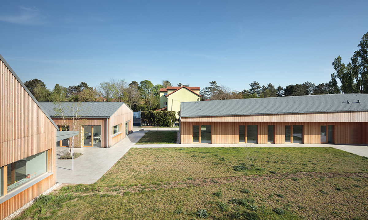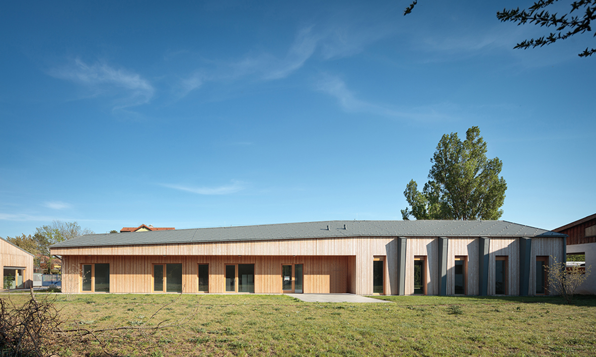 Detailbeschreibung: Das Schulungsgebäude wurde so positioniert, dass einerseits die gewünschte Abgrenzung Richtung östlichen Nachbarn erfolgte und andererseits die Wiese in Kombination mit dem Tagesgruppengebäude zum zentralen „Platz“ des Baukörperensembles gefasst wurde.