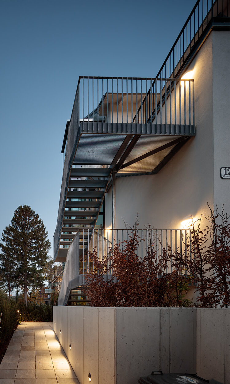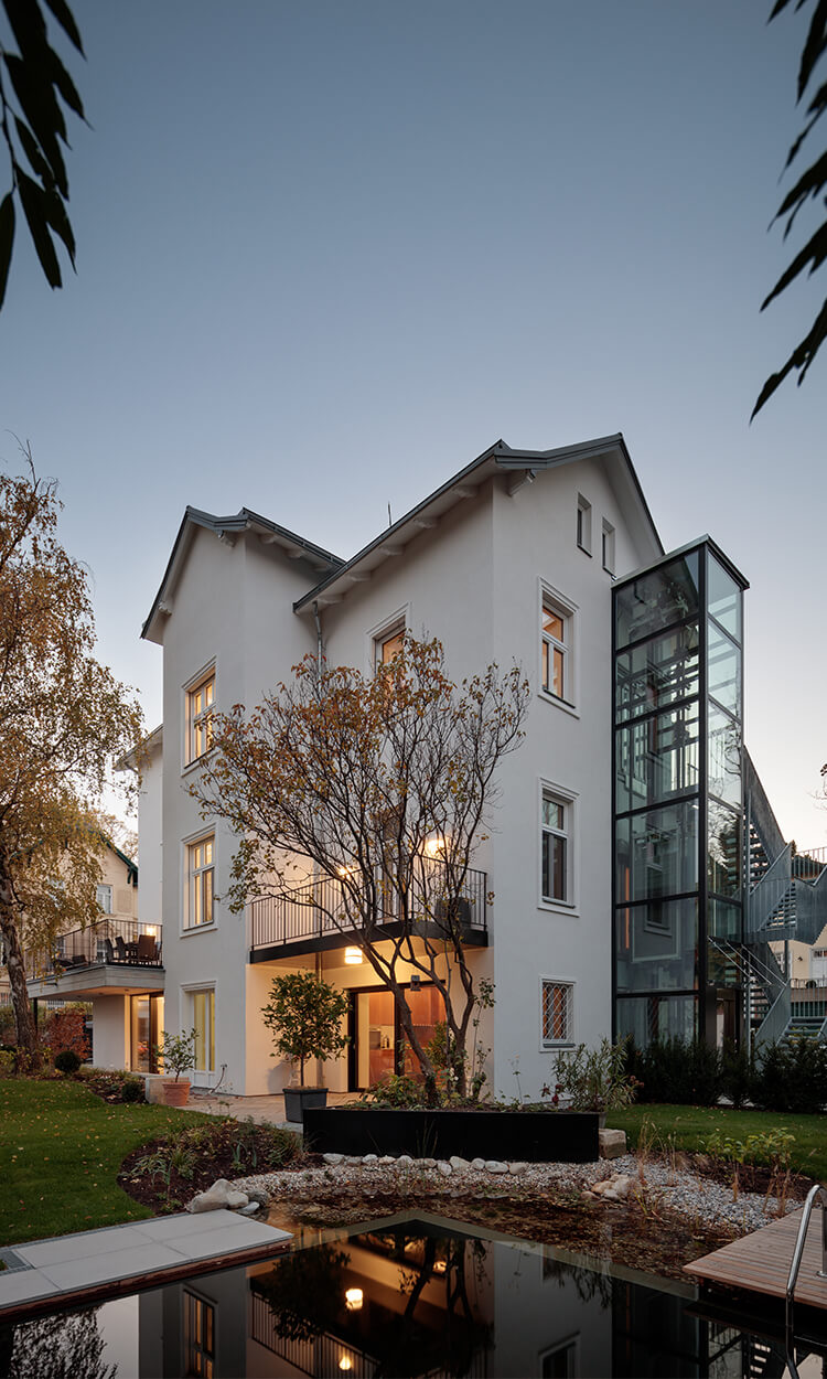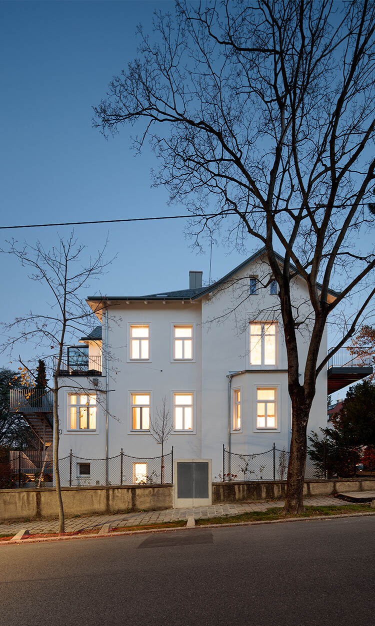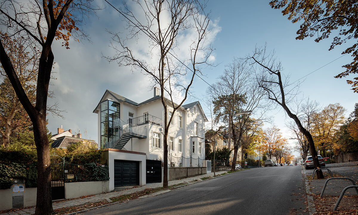 Wegen der Hanglage war es möglich die Niveaus so zu koordinieren, dass nun der Eingang ins Gebäude nicht mehr über ein Zwischenpodest, sondern direkt in der unteren Ebene erfolgt. Die Räume der unteren Ebene (des ehemaligen Kellers) wurden durch die direkte Verbindung in den Garten massiv aufgewertet. Eine Trockenlegung erfolgte mittels Durchschneidens der Mauern sowie zusätzlich einer Drainagierung. Die beiden Geschoße sind mittels einer internen Stiege sowie über einen an der Nordseite angebauten Lift verbunden. Ebenfalls an der Nordseite wurde auch eine Treppenturm errichtet, über welchen nun die oberste Ebene als eigenständige Wohneinheit, erreichbar ist. Dadurch konnten die Flächen des ehemaligen Stiegenhauses in allen 3 Ebenen für die, ideal übereinander gelegenen, neuen großzügigen Badezimmer verwendet werden. Die Fassaden bzw. die Fensteröffnungen wurden neu geordnet, da über die vergangenen Jahrzehnte einige Öffnungen geschlossen bzw. verändert worden waren. An 4 Stellen wurde neue Balkone bzw. Terrassen errichtet.