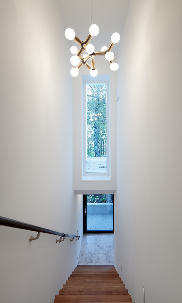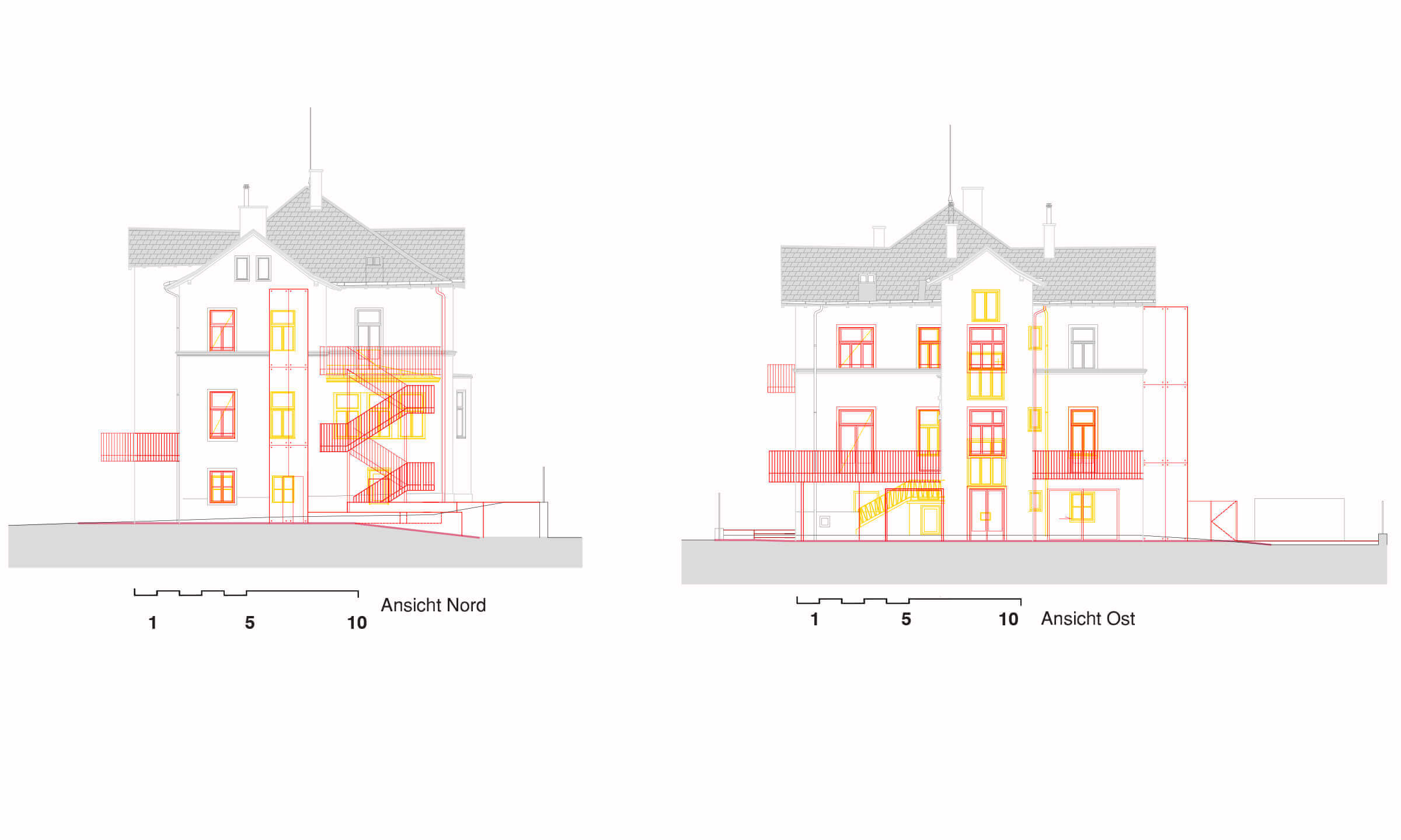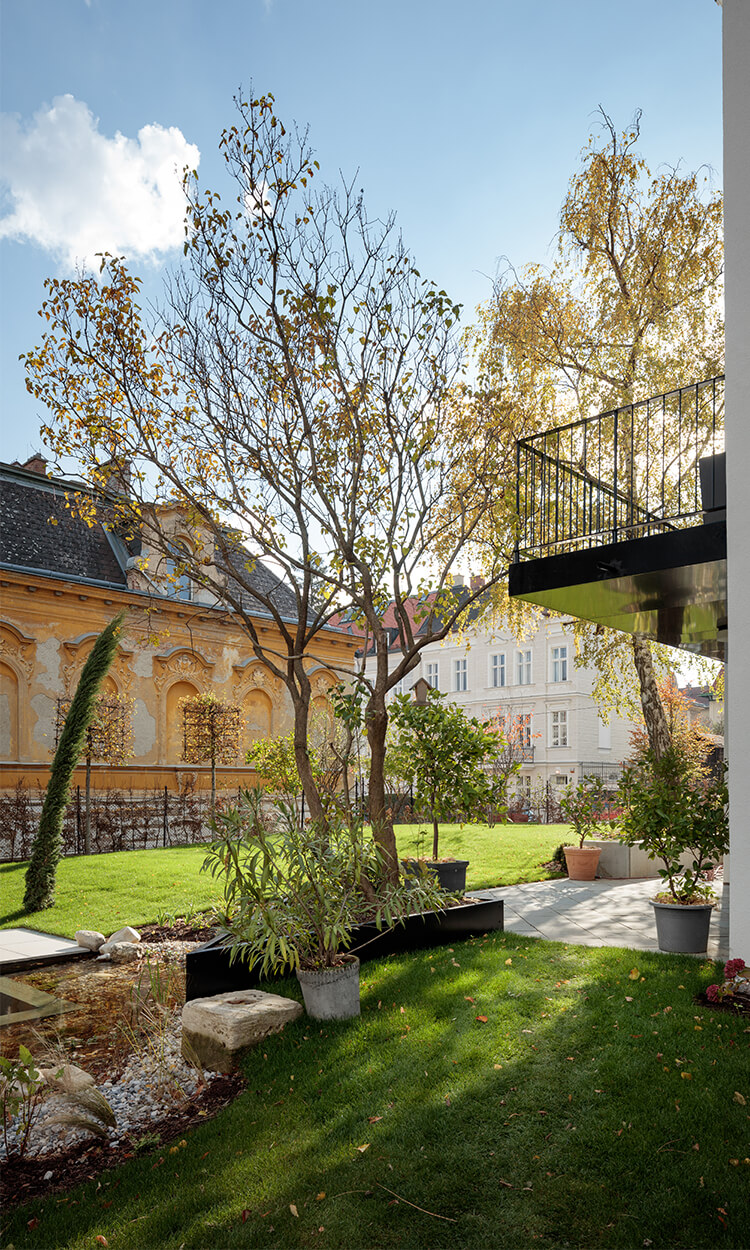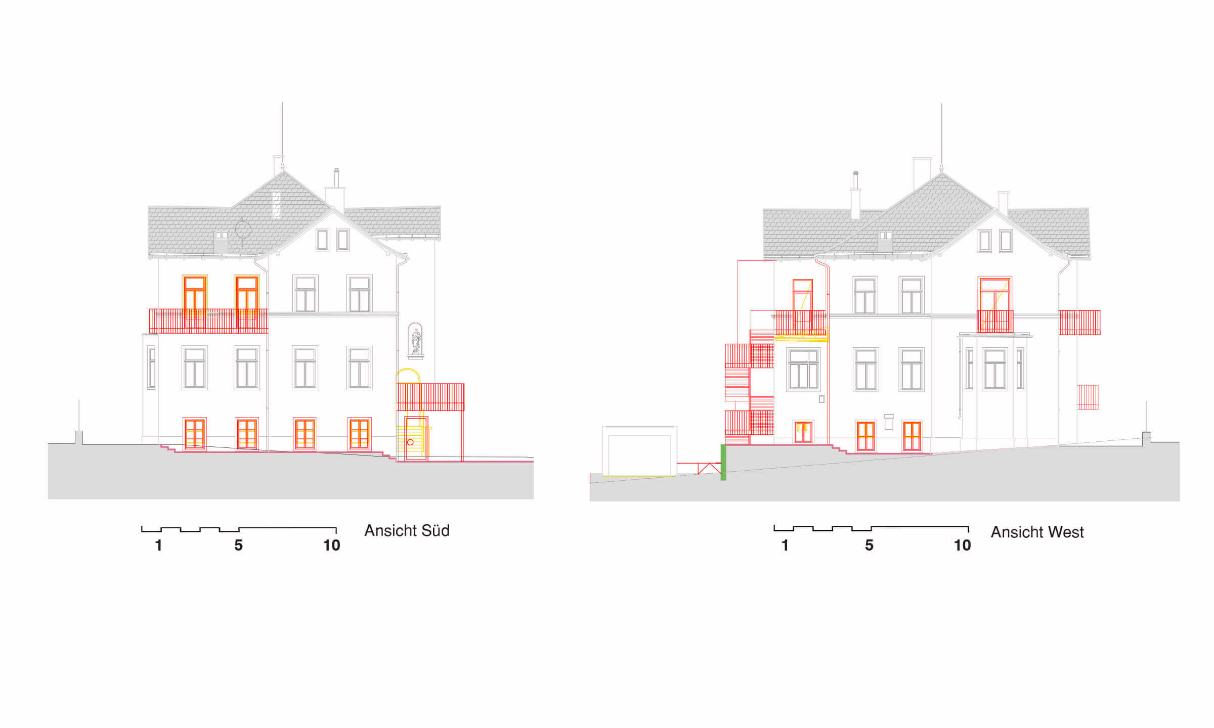 Wegen der Hanglage war es möglich die Niveaus so zu koordinieren, dass nun der Eingang ins Gebäude nicht mehr über ein Zwischenpodest, sondern direkt in der unteren Ebene erfolgt. Die Räume der unteren Ebene (des ehemaligen Kellers) wurden durch die direkte Verbindung in den Garten massiv aufgewertet. Eine Trockenlegung erfolgte mittels Durchschneidens der Mauern sowie zusätzlich einer Drainagierung. Die beiden Geschoße sind mittels einer internen Stiege sowie über einen an der Nordseite angebauten Lift verbunden. Ebenfalls an der Nordseite wurde auch eine Treppenturm errichtet, über welchen nun die oberste Ebene als eigenständige Wohneinheit, erreichbar ist. Dadurch konnten die Flächen des ehemaligen Stiegenhauses in allen 3 Ebenen für die, ideal übereinander gelegenen, neuen großzügigen Badezimmer verwendet werden. Die Fassaden bzw. die Fensteröffnungen wurden neu geordnet, da über die vergangenen Jahrzehnte einige Öffnungen geschlossen bzw. verändert worden waren. An 4 Stellen wurde neue Balkone bzw. Terrassen errichtet.
