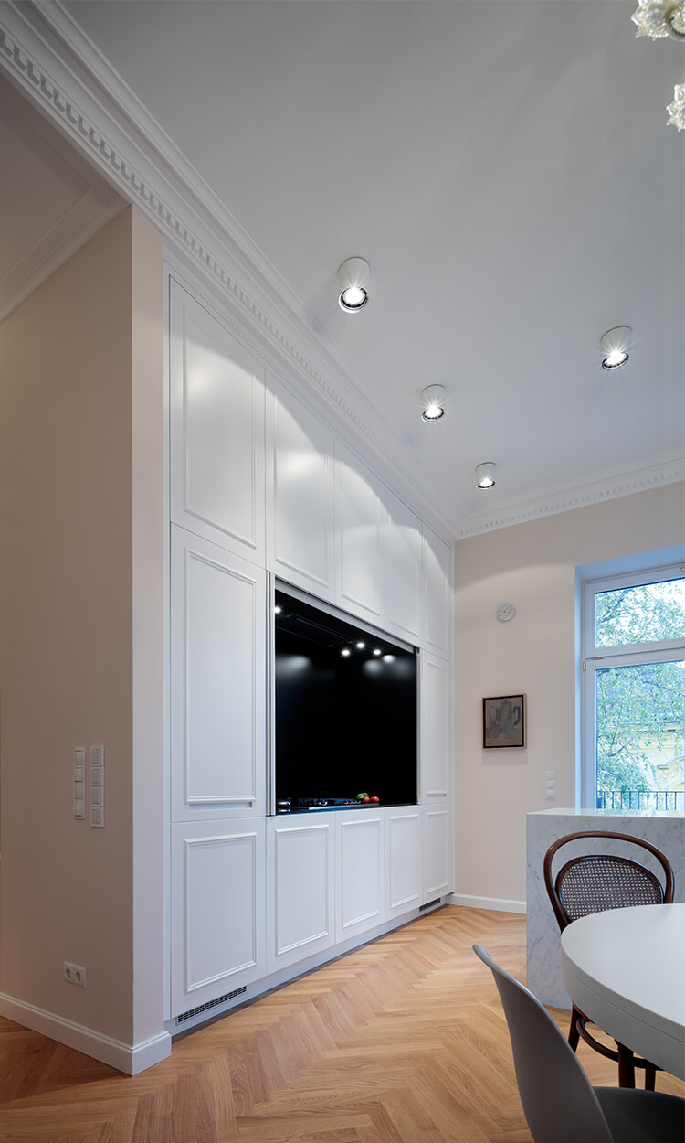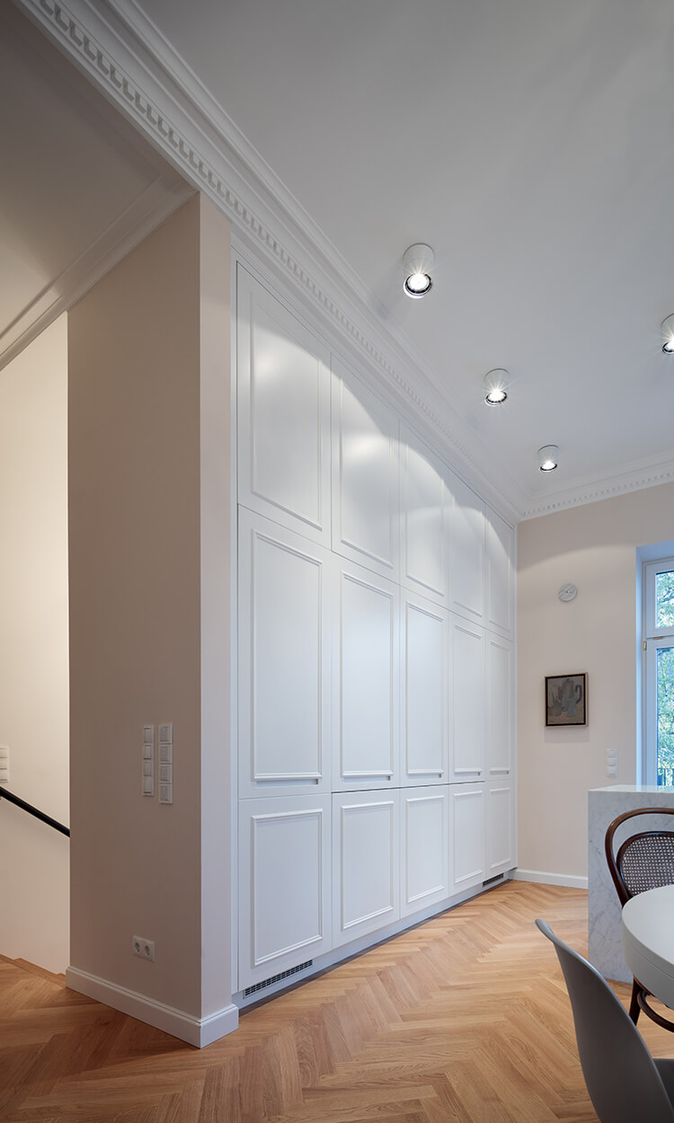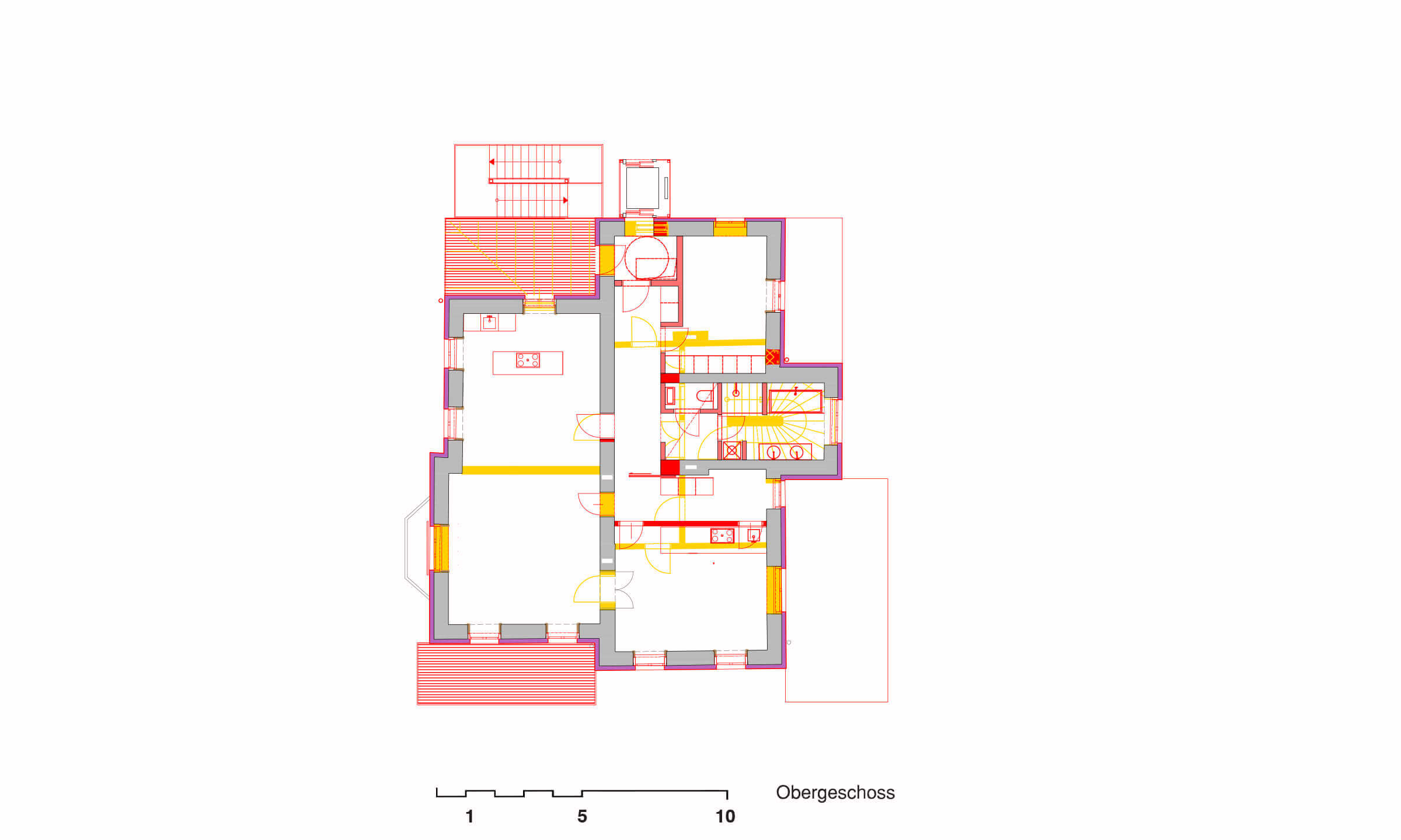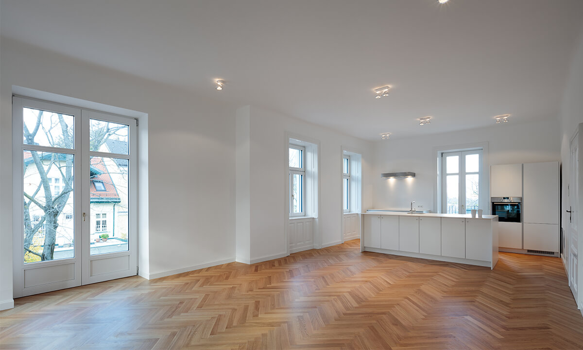 Ausgangslage war eine Jahrhundertwendevilla mit 2 Geschoßwohnungen; im Hochparterre und im 1. Stock. Aufgrund der Anforderung der Barrierefreiheit seitens der Eigentümer wurden das Hochparterre und der Keller zu einer Wohneinheit zusammengefasst.