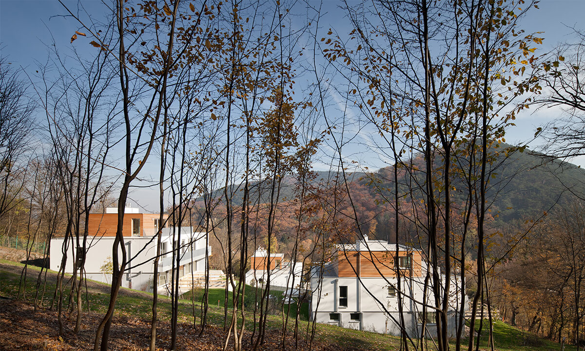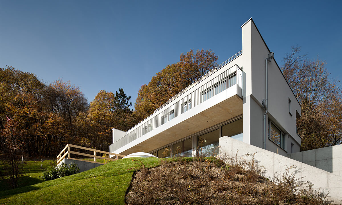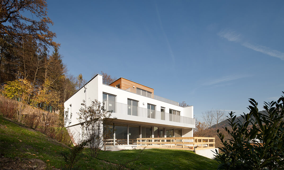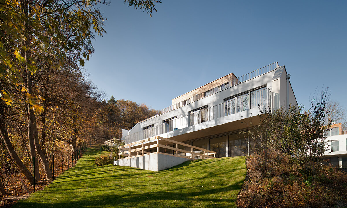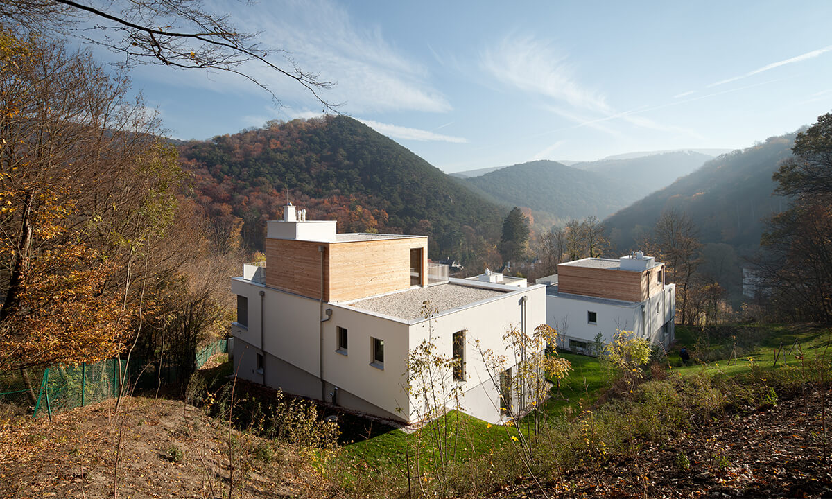 Das Grundstück ist ein sehr steiler Süd-Ost-Hang mit reizvollen Ausblicken in die umgebenden Hügel und Föhrenwälder. Die 4 Häuser wurden so positioniert und ausgerichtet, dass ein Maximum an Aussicht und Besonnung, aber auch an Privatsphäre geschaffen werden konnte.