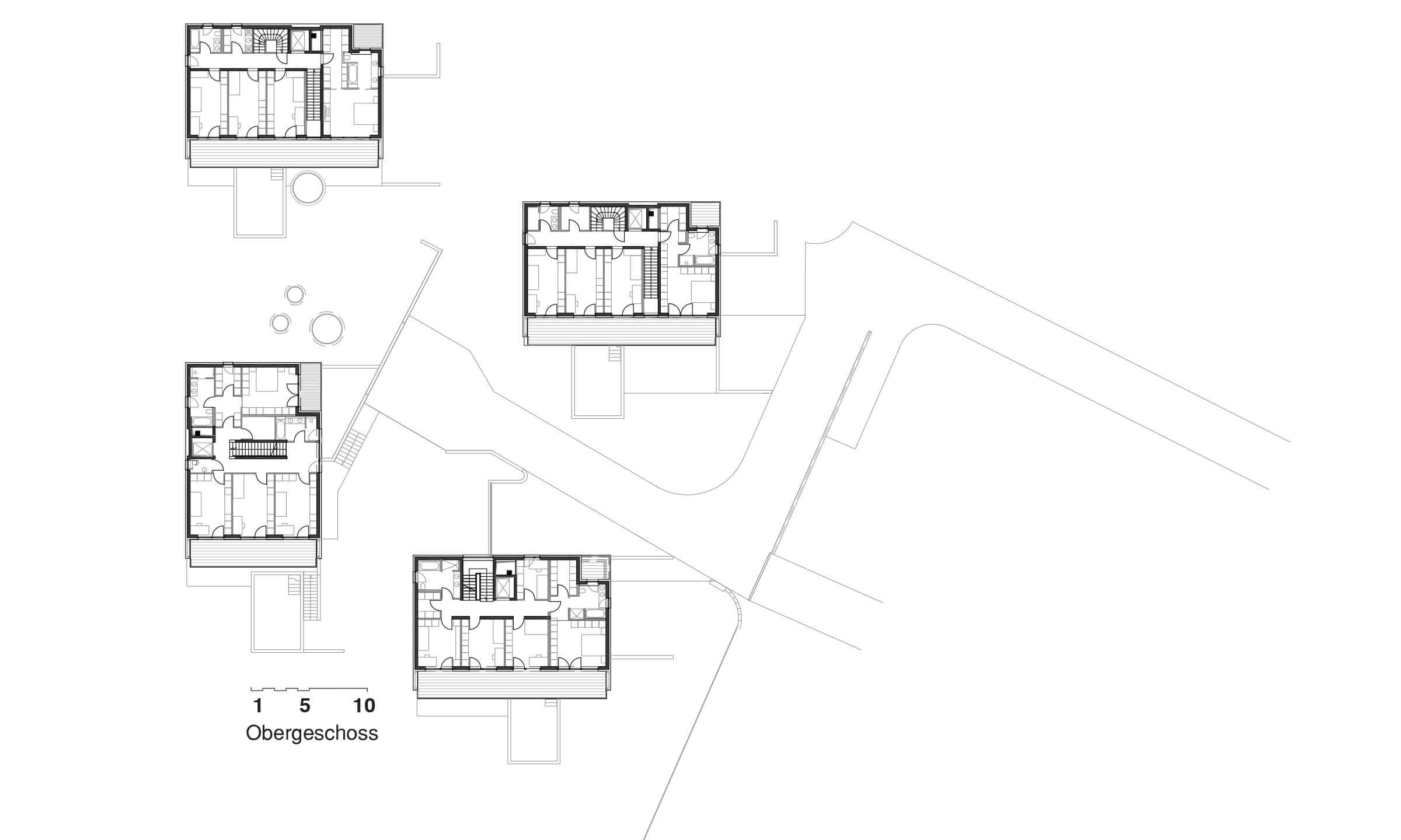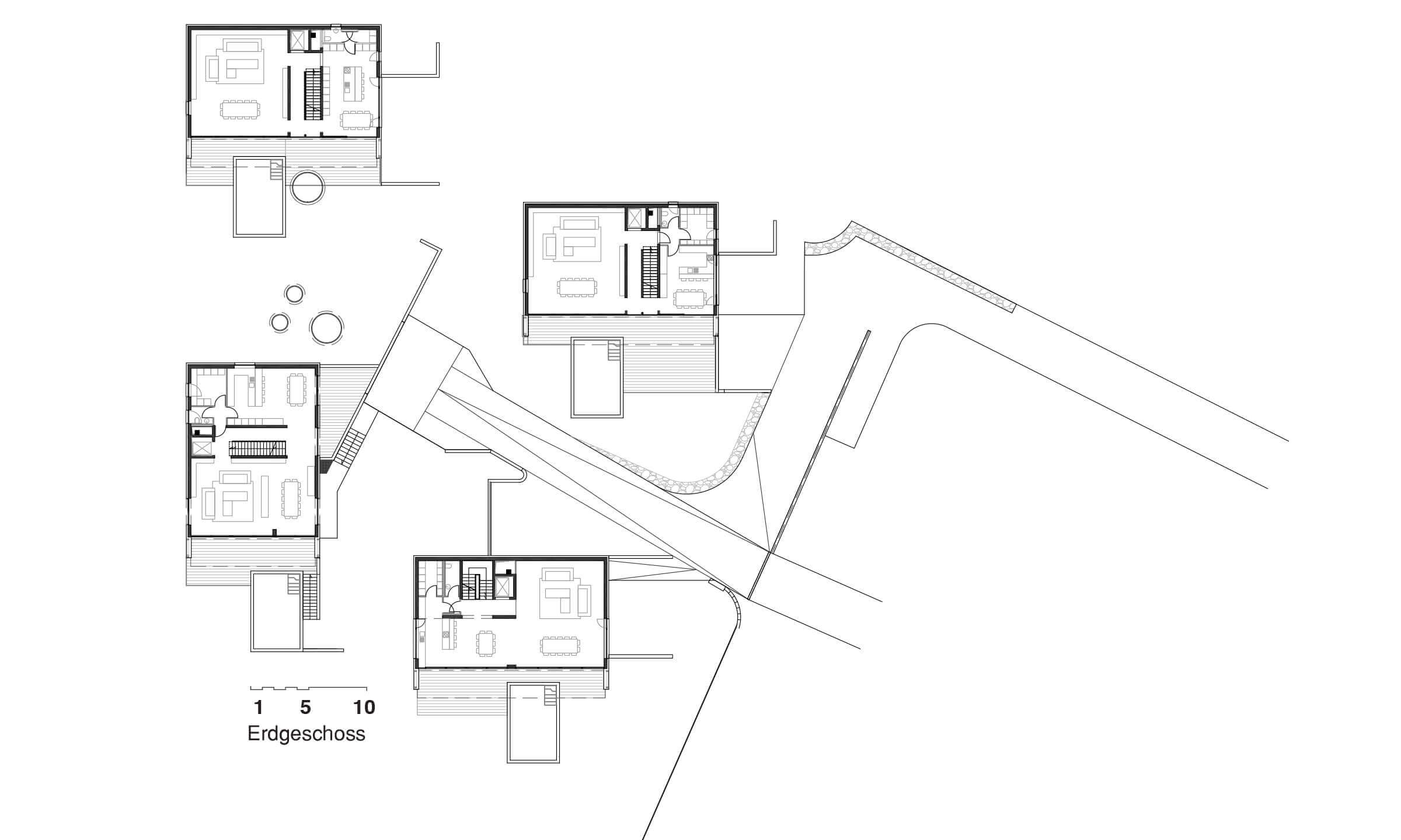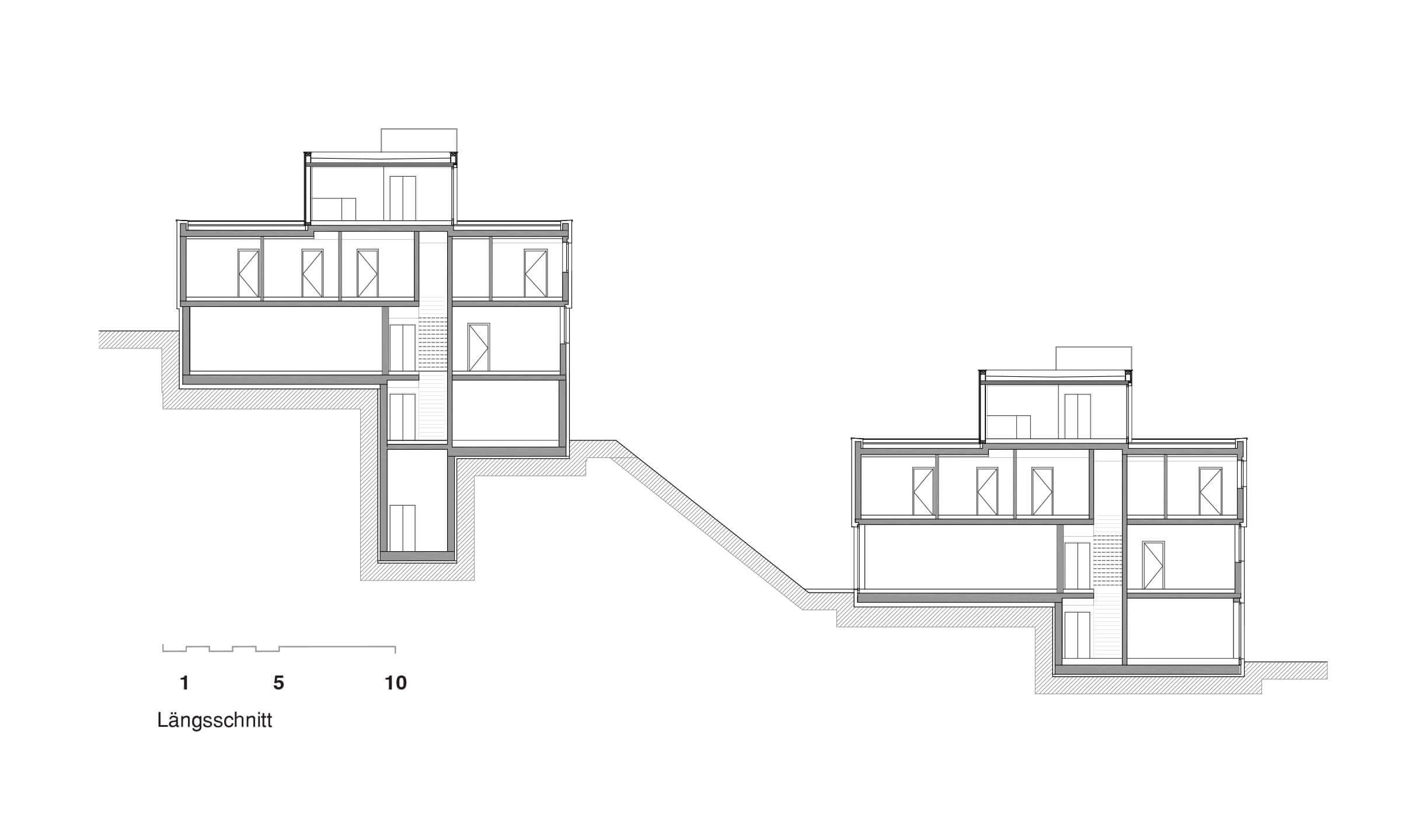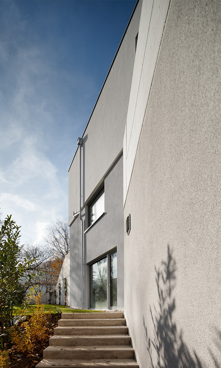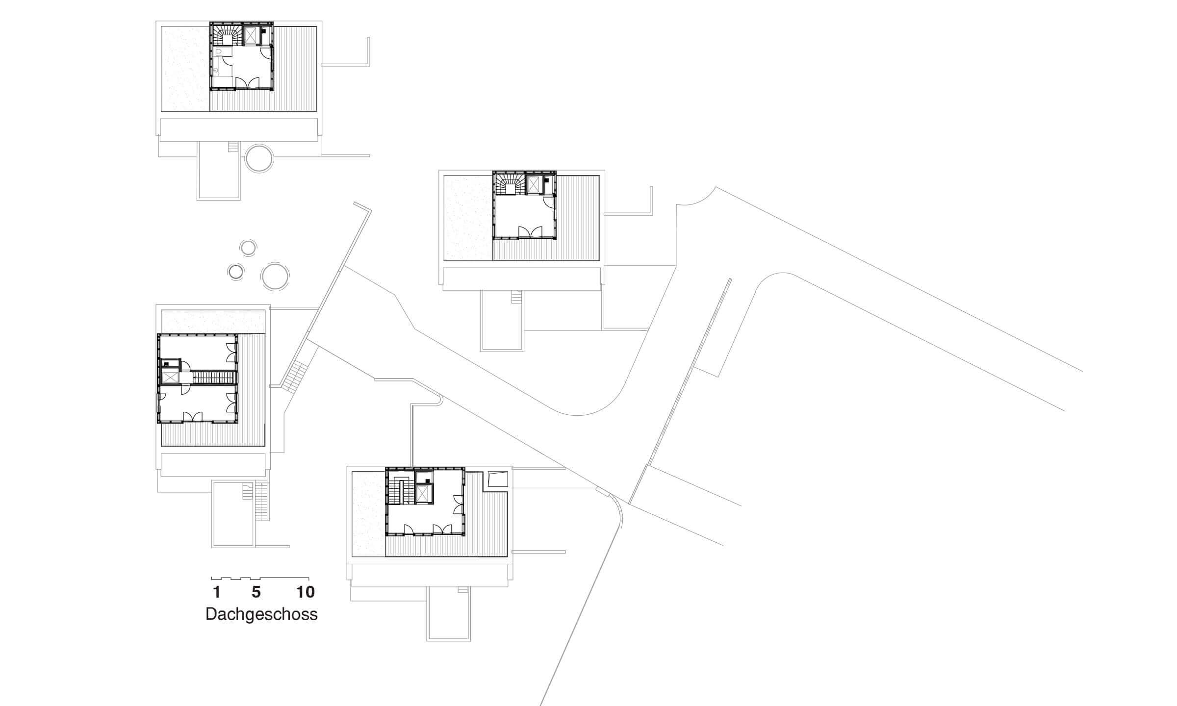Aufgrund der Hanglage wurde für alle 4 Häuser eine Typologie entwickelt, bei welcher der Zugang ins Haus im Souterrain erfolgt. Ebenso der Nebeneingang von der (in den Hang eingegrabenen) Garage. Im Souterrain befinden sich neben Technik- und Lagerräumen auch Aufenthaltsräume, welche hangabwärts liegend Terrassentüren ins Freie haben und als eigene Wohneinheit genutzt werden könnten.