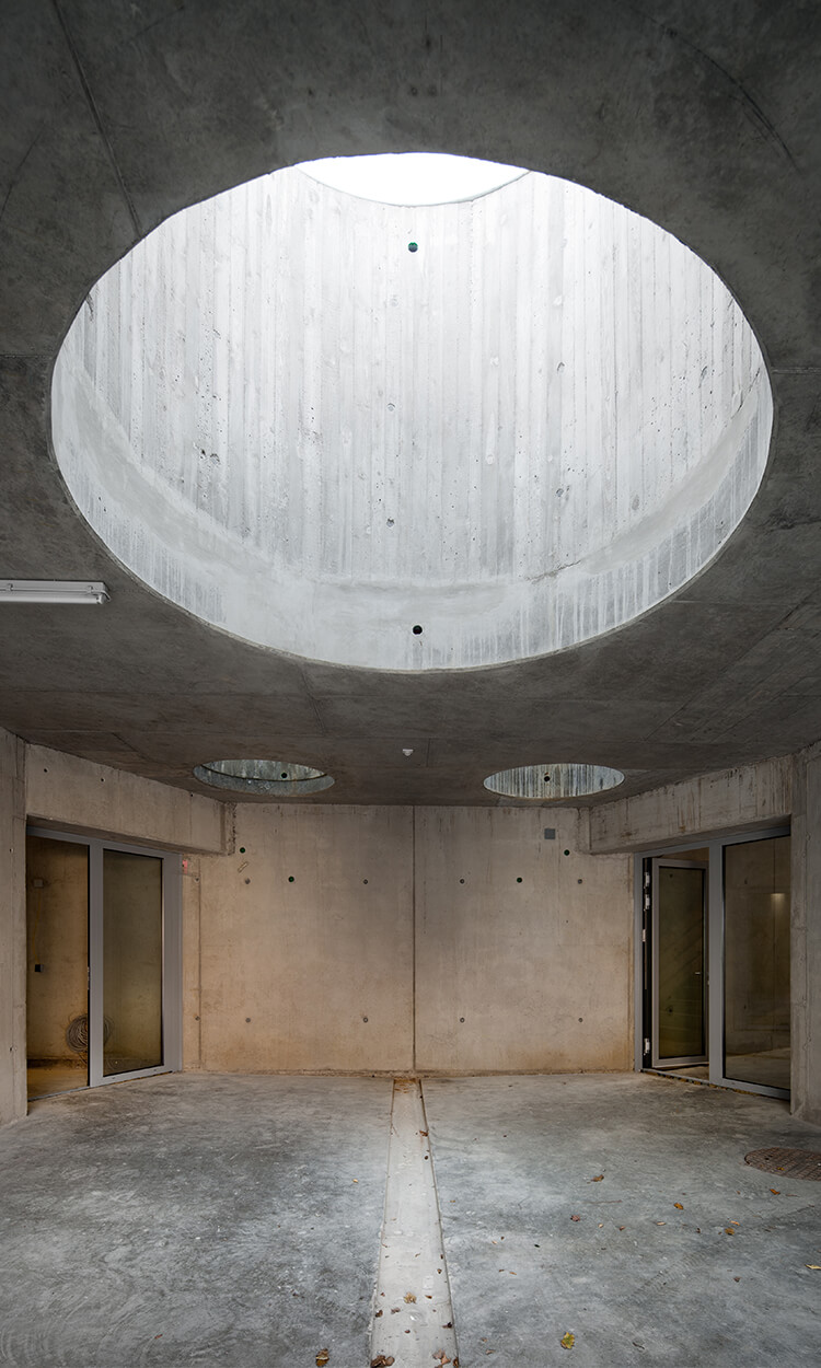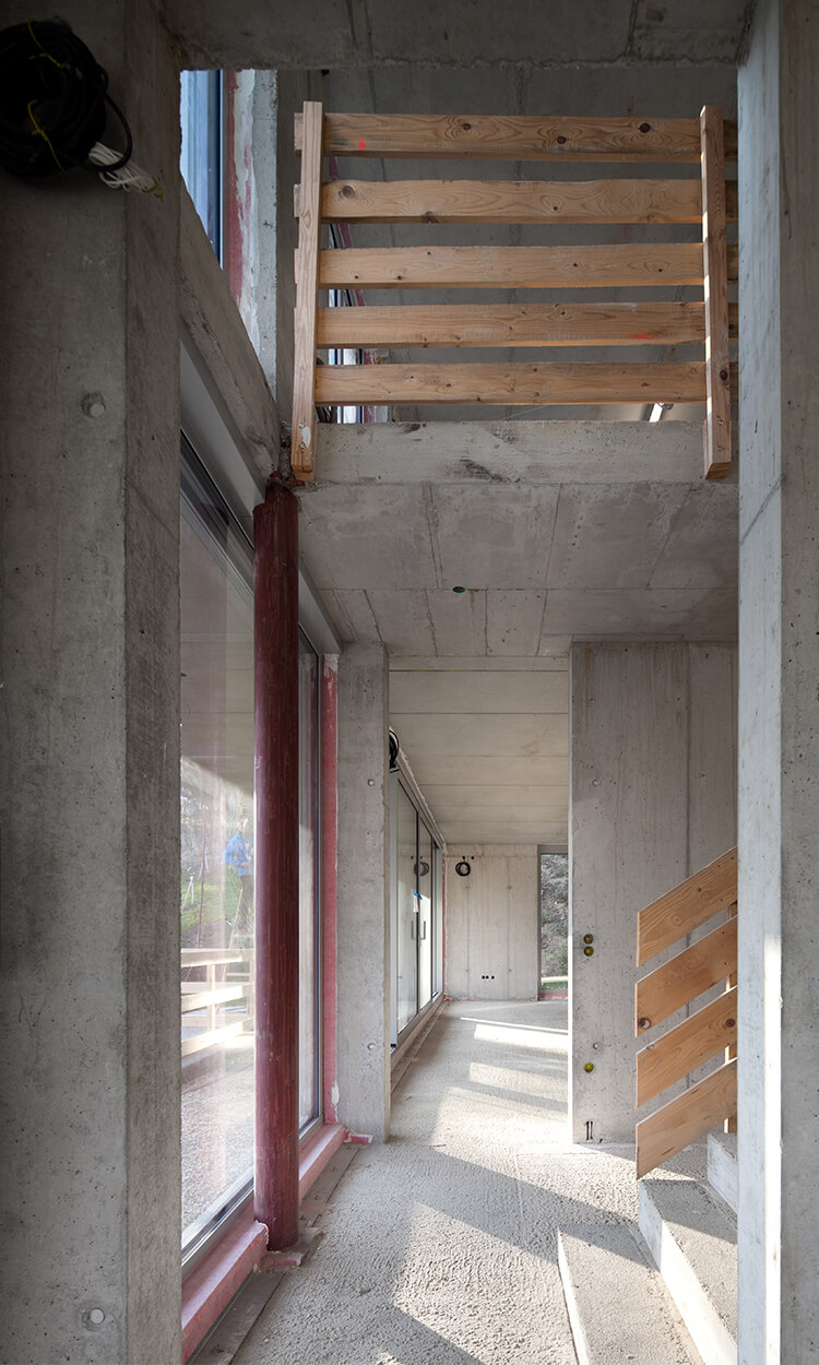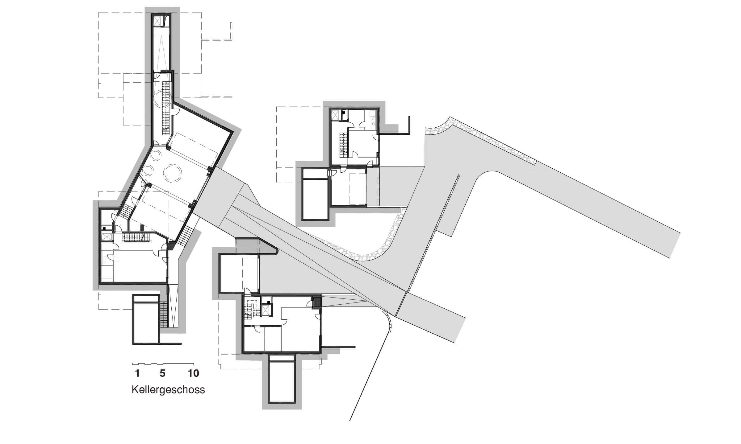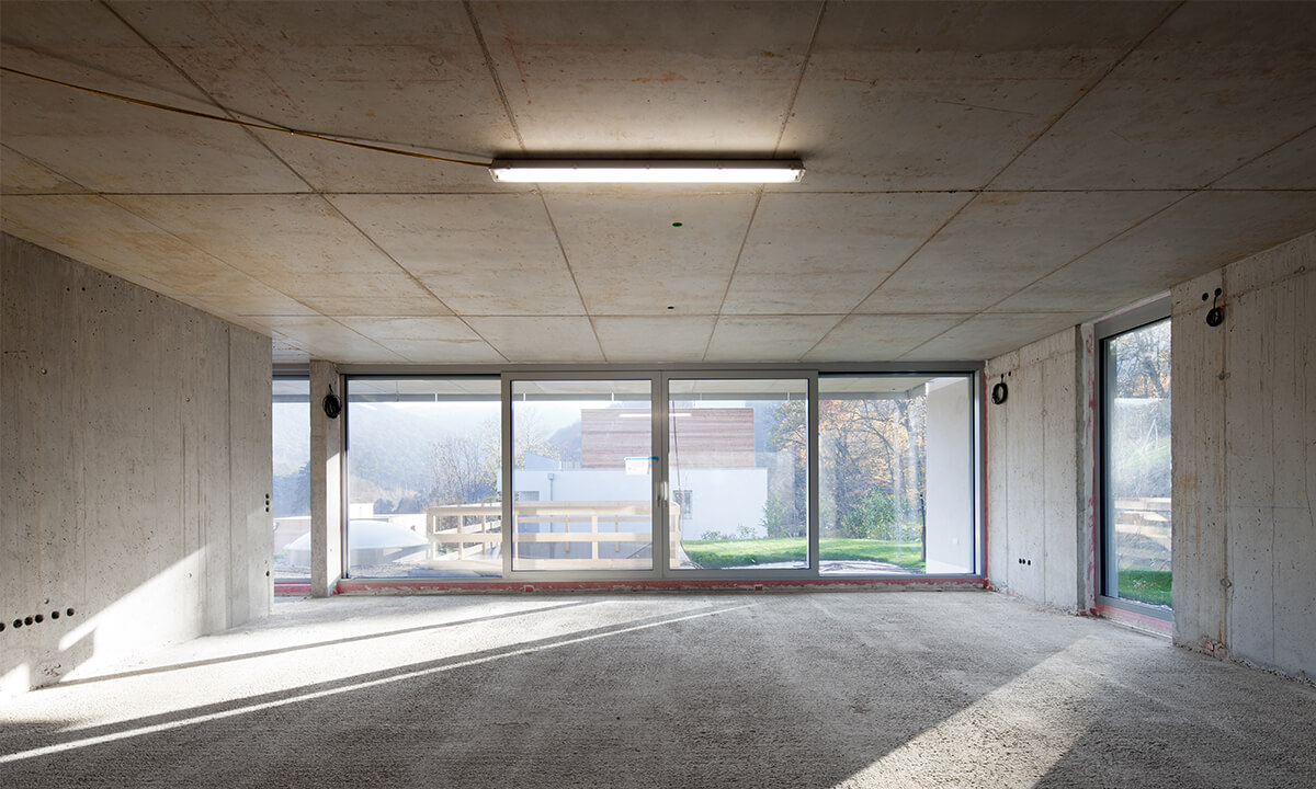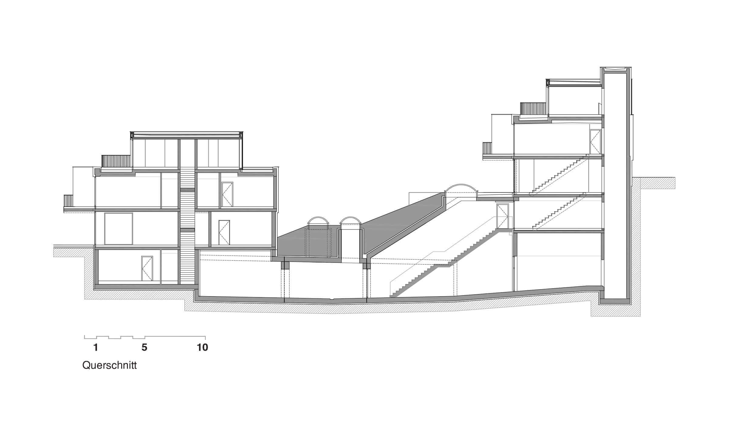 Aufgrund der Hanglage wurde für alle 4 Häuser eine Typologie entwickelt, bei welcher der Zugang ins Haus im Souterrain erfolgt. Ebenso der Nebeneingang von der (in den Hang eingegrabenen) Garage. Im Souterrain befinden sich neben Technik- und Lagerräumen auch Aufenthaltsräume, welche hangabwärts liegend Terrassentüren ins Freie haben und als eigene Wohneinheit genutzt werden könnten.