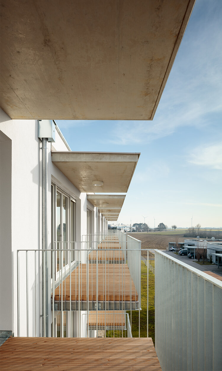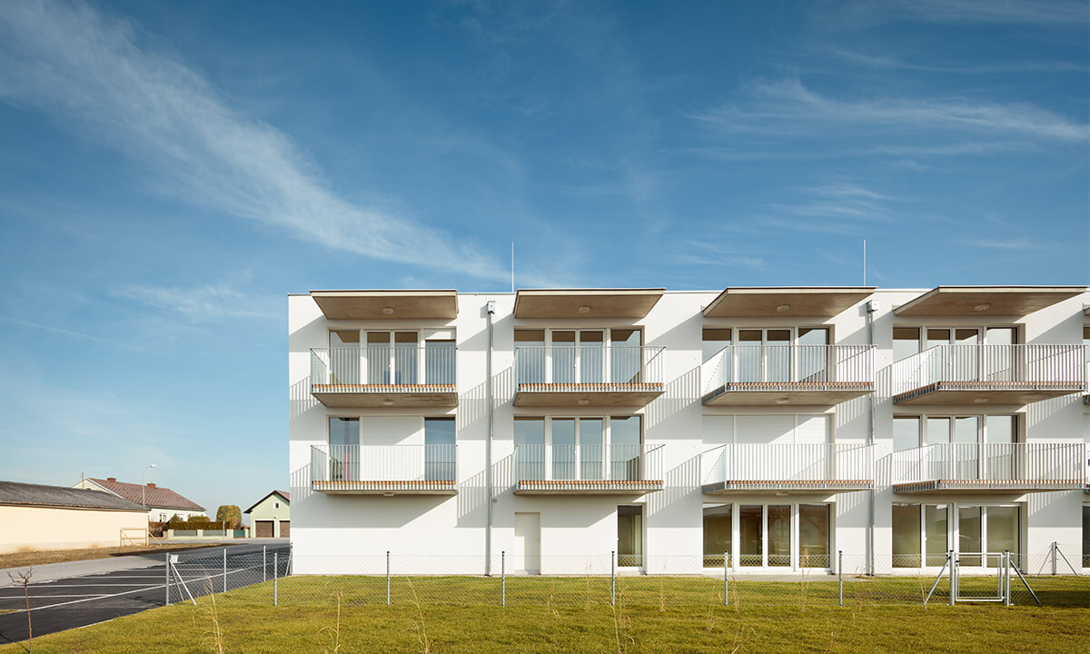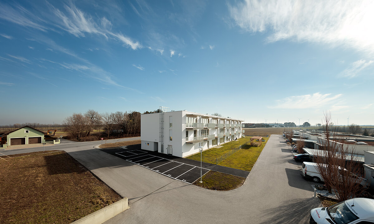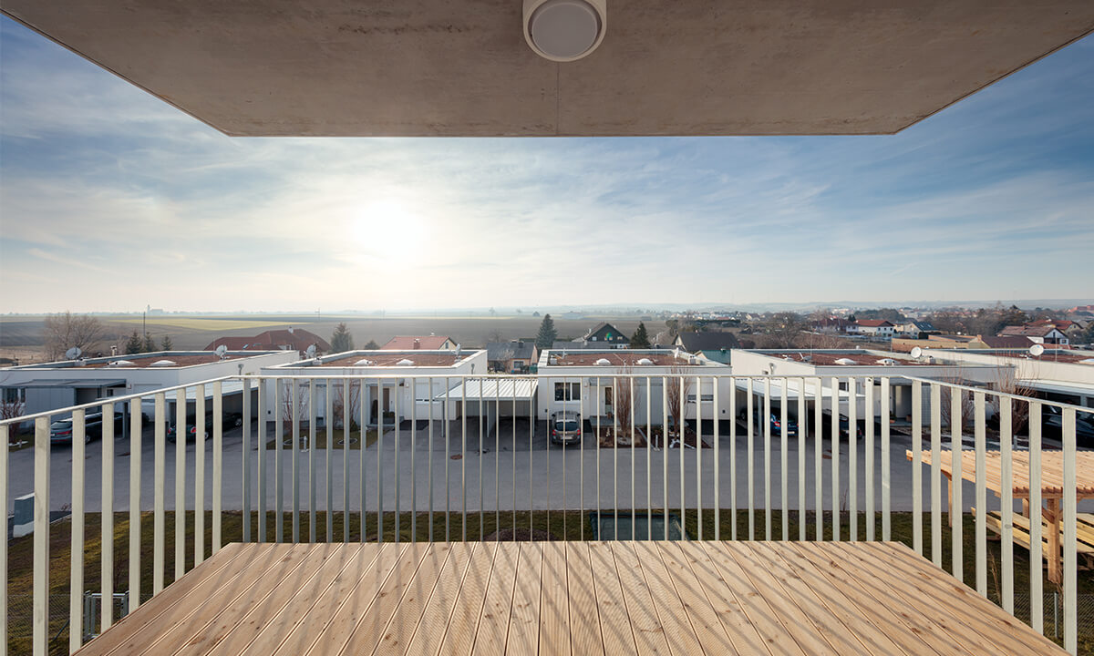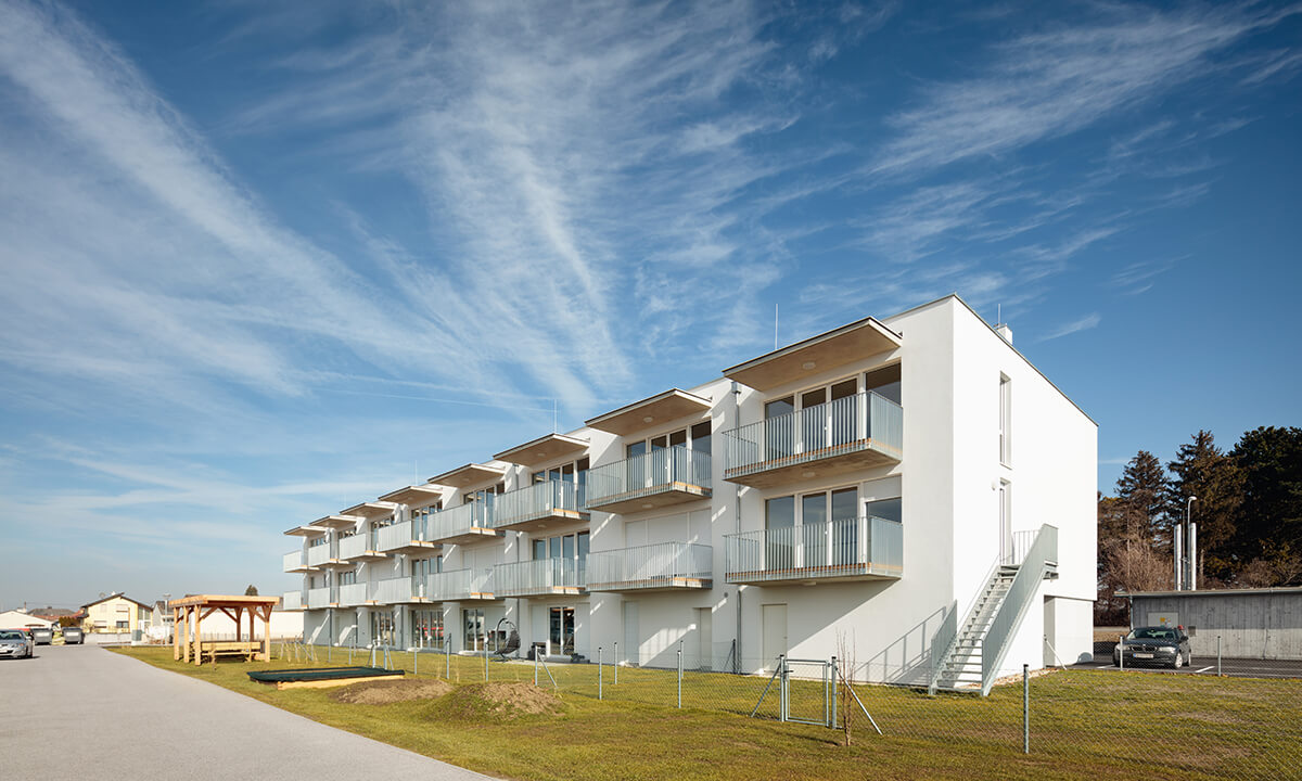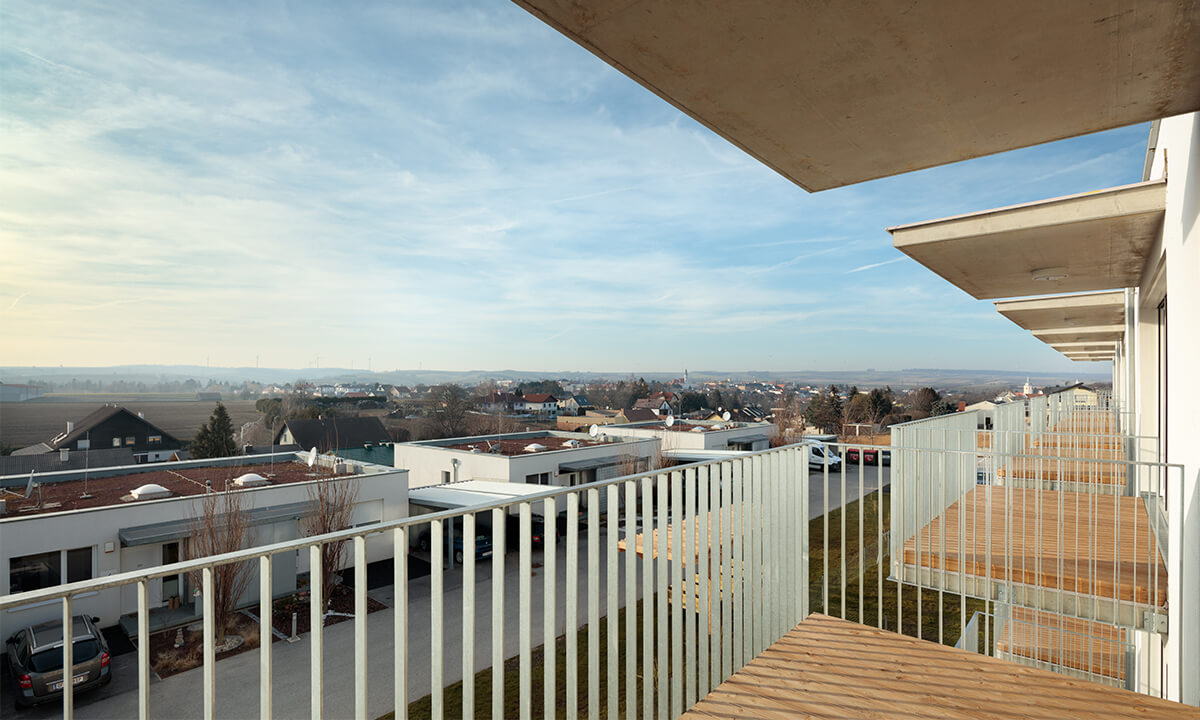 Bei der Entwicklung der Wohnungen wurde auf eine sehr kompakte Größe geachtet. In den Obergeschoßen gibt es 2- bzw. 3-Zimmer-Wohnungen. Jede Wohnung hat einen großen, dem Wohnzimmer vorgelagerten, Balkon Richtung Westen mit einem weiten Blick über den Ort und den Hügeln der Umgebung. Im Erdgeschoß gibt es 2 größere Wohnungen mit Eigengarten.