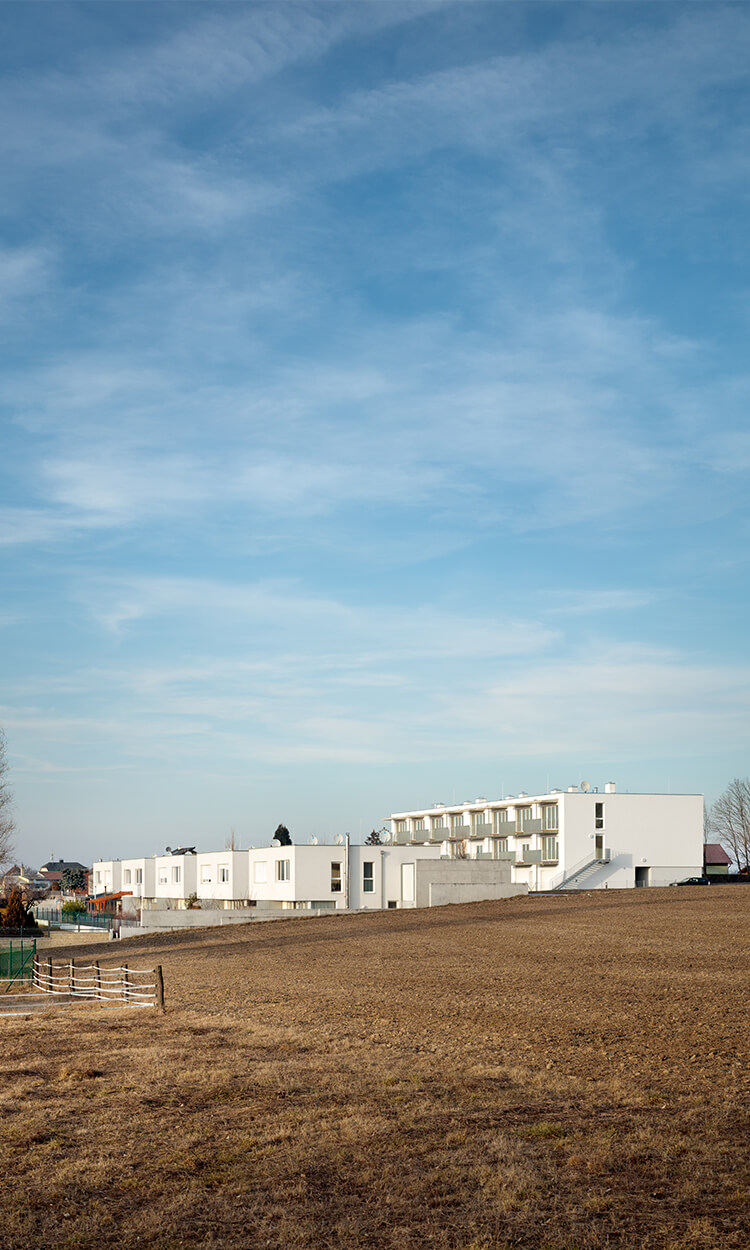 Das Nord-Süd ausgerichtete Grundstück befindet sich in Ortsrandlage und weist in Ost-West Richtung einen Höhenunterschied von rund 3-4m auf. Im Osten befindet sich eine relativ stark befahrene Straße. Entlang dieser Bundesstraße wurde der durchgehende dreigeschossiger Baukörper mit den Geschoßwohnungen errichtet. Die Bebauung im Westen erfolgte hingegen durch kompakte Doppelhäuser, welche an einer neu geschaffenen Geländekante so platziert wurden, dass sie innerhalb der Anlage als eingeschossig wahrgenommen werden, sich jedoch zum Garten und nach Westen hin mit 2 Geschoßen orientieren.
