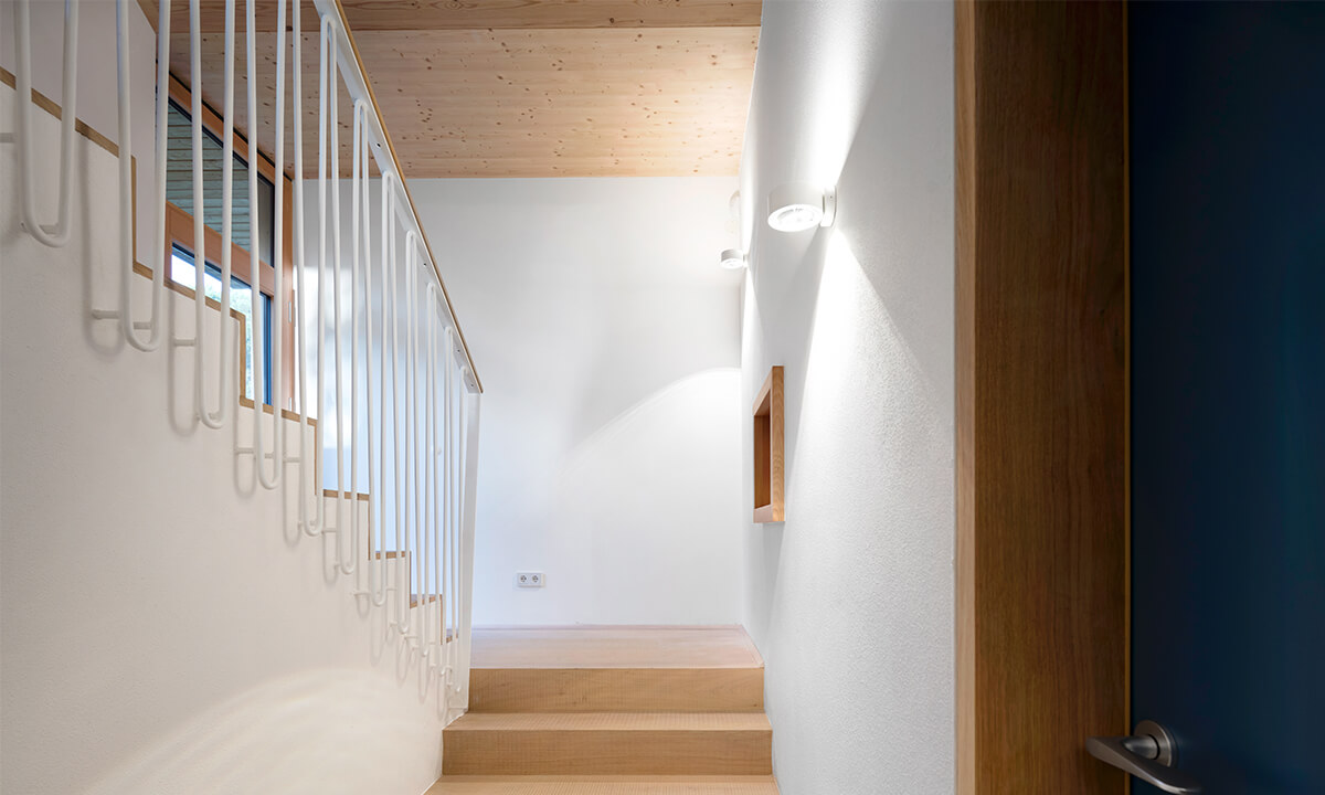 Das Dach des westseitigen Zubaus ist teilweise als Flachdach ausgebildet. Dadurch konnte eine 2. sehr hoch liegende Terrasse mit Fernblick sowie beim Übergang zum Steildach ein großes Giebelfenster geschaffen werden, welches den Gang und den Stiegenbereich belichtet. Im Bereich des Steildaches wurden in den beiden ostseitigen Schlafzimmern Galerieebenen eingezogen.