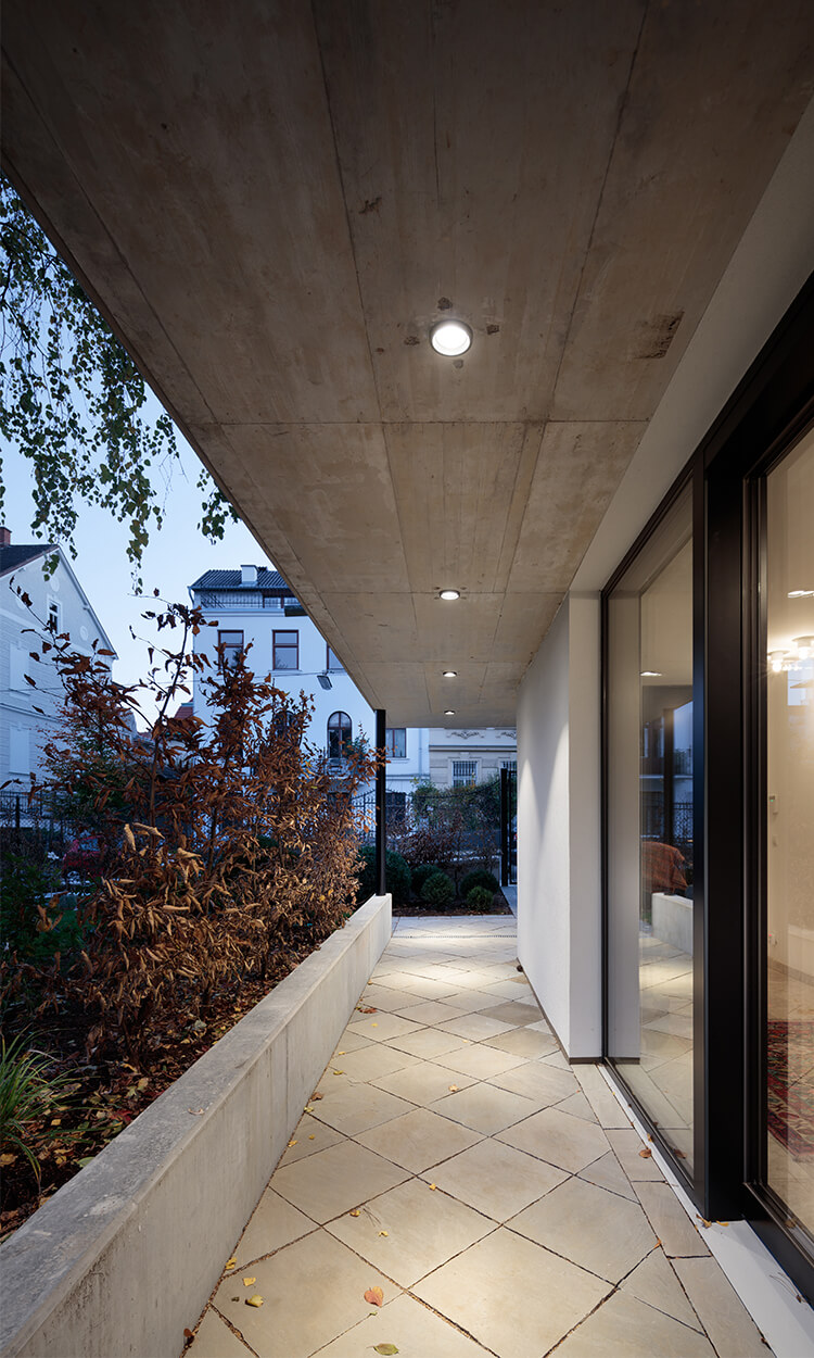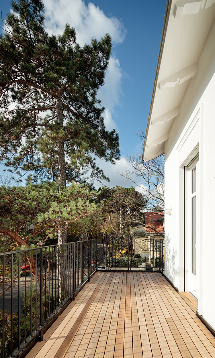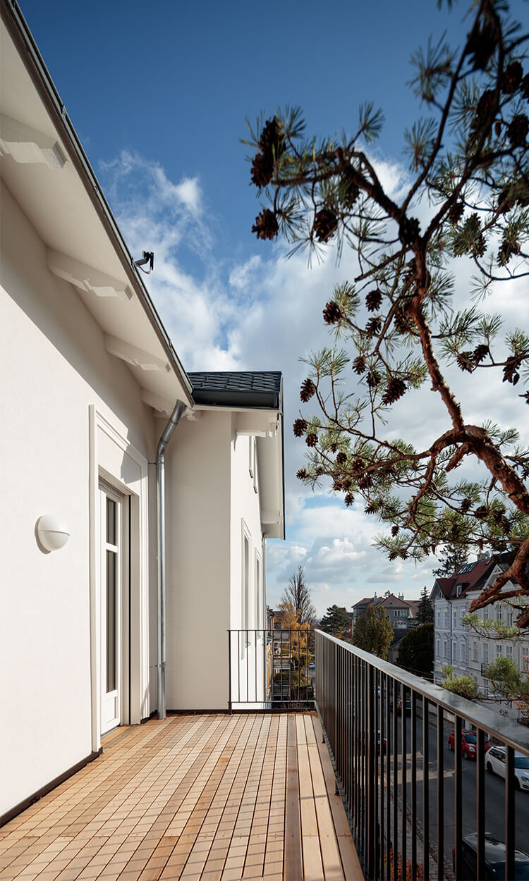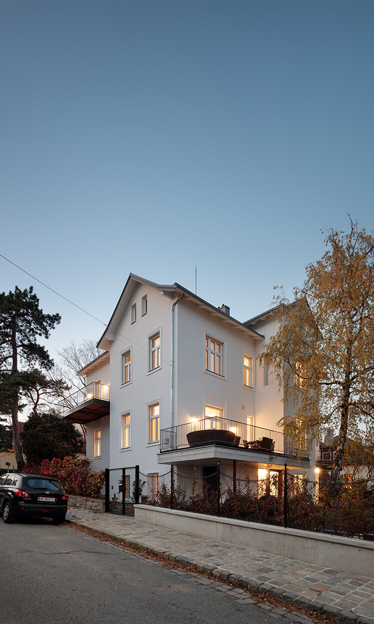 Wegen der Hanglage war es möglich die Niveaus so zu koordinieren, dass nun der Eingang ins Gebäude nicht mehr über ein Zwischenpodest, sondern direkt in der unteren Ebene erfolgt. Die Räume der unteren Ebene (des ehemaligen Kellers) wurden durch die direkte Verbindung in den Garten massiv aufgewertet. Eine Trockenlegung erfolgte mittels Durchschneidens der Mauern sowie zusätzlich einer Drainagierung. Die beiden Geschoße sind mittels einer internen Stiege sowie über einen an der Nordseite angebauten Lift verbunden. Ebenfalls an der Nordseite wurde auch eine Treppenturm errichtet, über welchen nun die oberste Ebene als eigenständige Wohneinheit, erreichbar ist. Dadurch konnten die Flächen des ehemaligen Stiegenhauses in allen 3 Ebenen für die, ideal übereinander gelegenen, neuen großzügigen Badezimmer verwendet werden. Die Fassaden bzw. die Fensteröffnungen wurden neu geordnet, da über die vergangenen Jahrzehnte einige Öffnungen geschlossen bzw. verändert worden waren. An 4 Stellen wurde neue Balkone bzw. Terrassen errichtet.