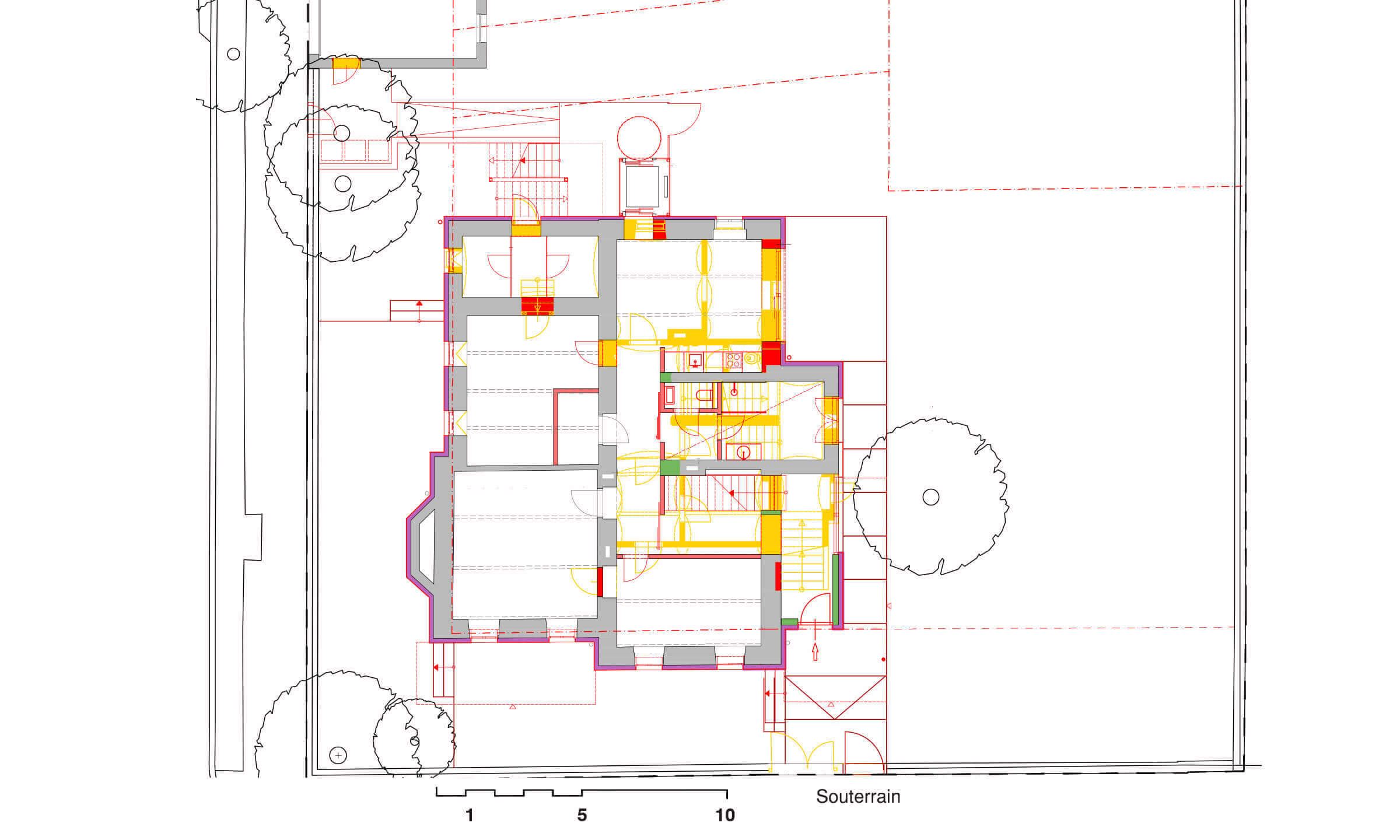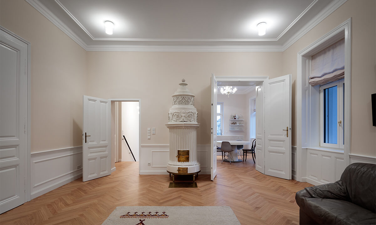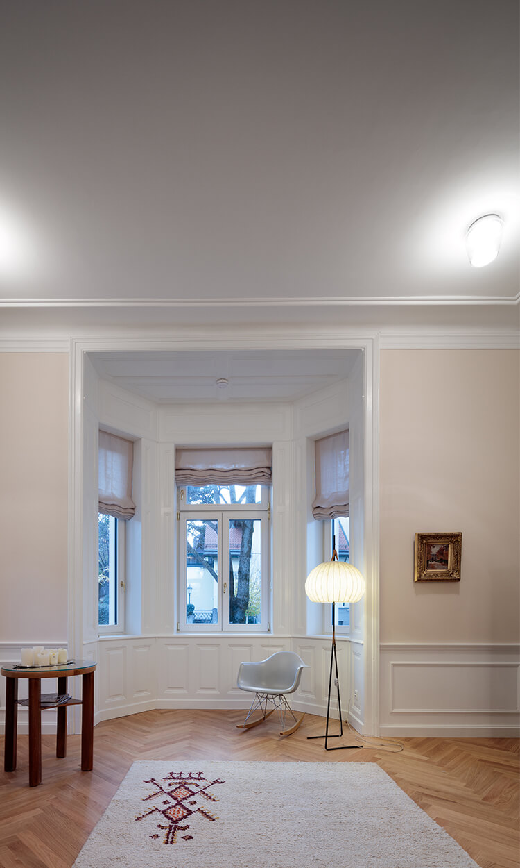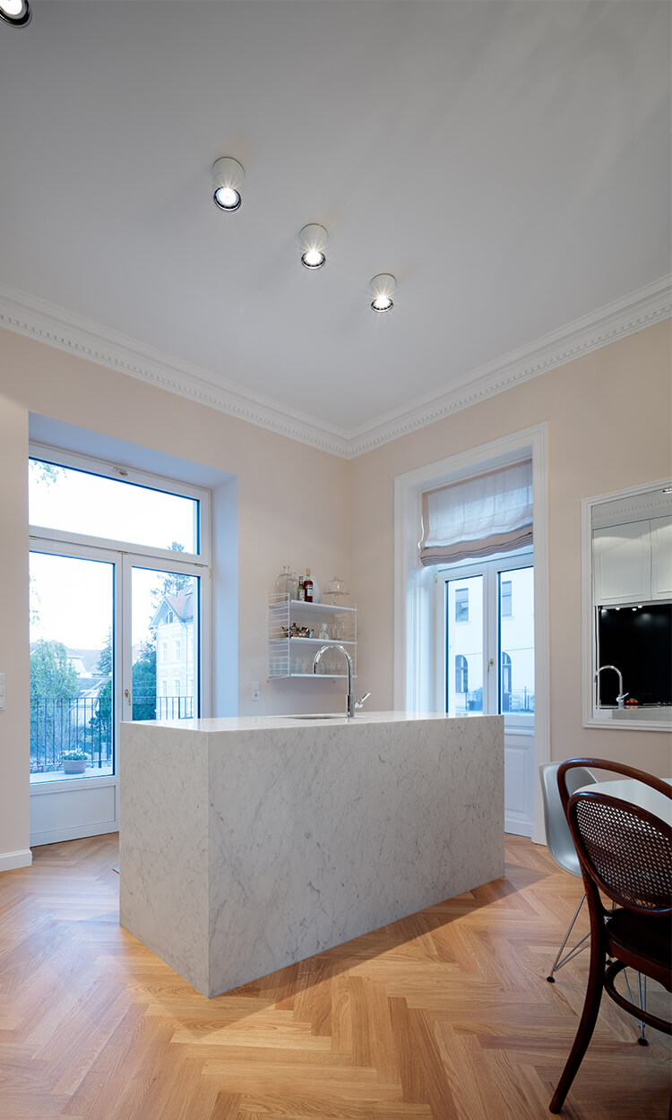Ausgangslage war eine Jahrhundertwendevilla mit 2 Geschoßwohnungen; im Hochparterre und im 1. Stock. Aufgrund der Anforderung der Barrierefreiheit seitens der Eigentümer wurden das Hochparterre und der Keller zu einer Wohneinheit zusammengefasst.