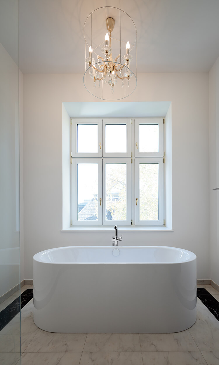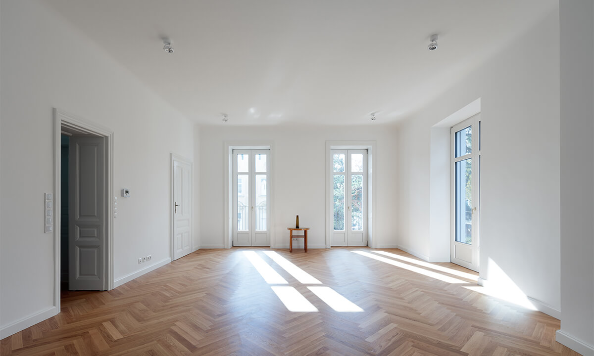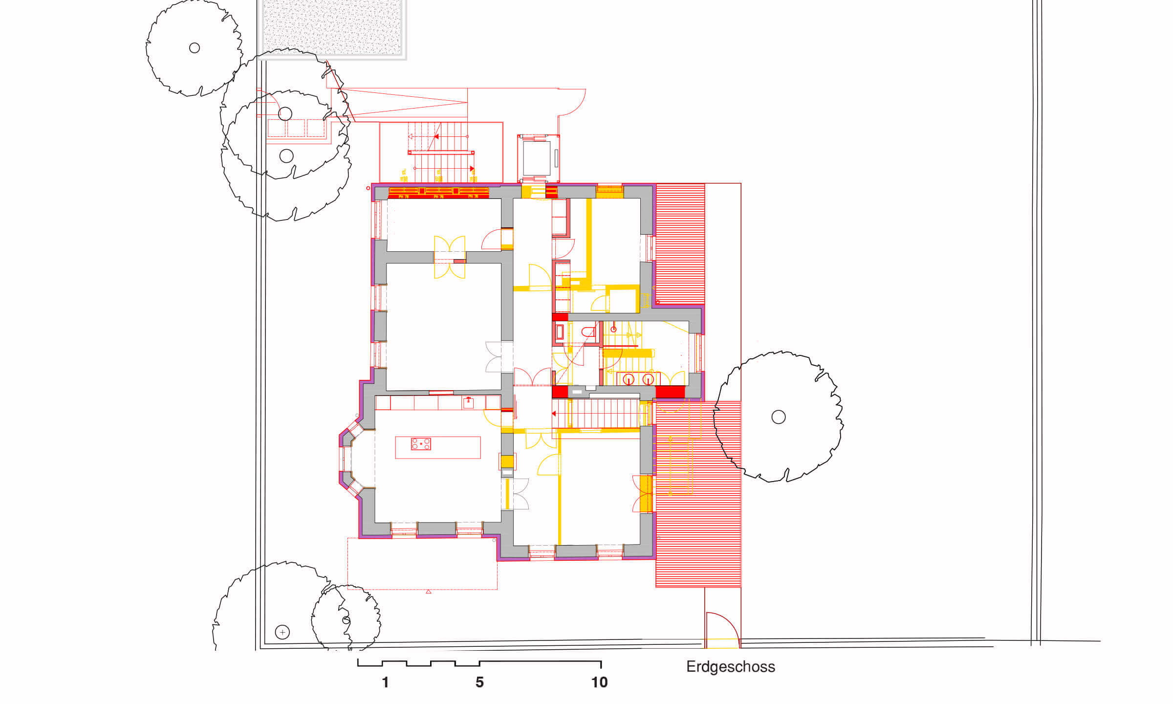 Ausgangslage war eine Jahrhundertwendevilla mit 2 Geschoßwohnungen; im Hochparterre und im 1. Stock. Aufgrund der Anforderung der Barrierefreiheit seitens der Eigentümer wurden das Hochparterre und der Keller zu einer Wohneinheit zusammengefasst.